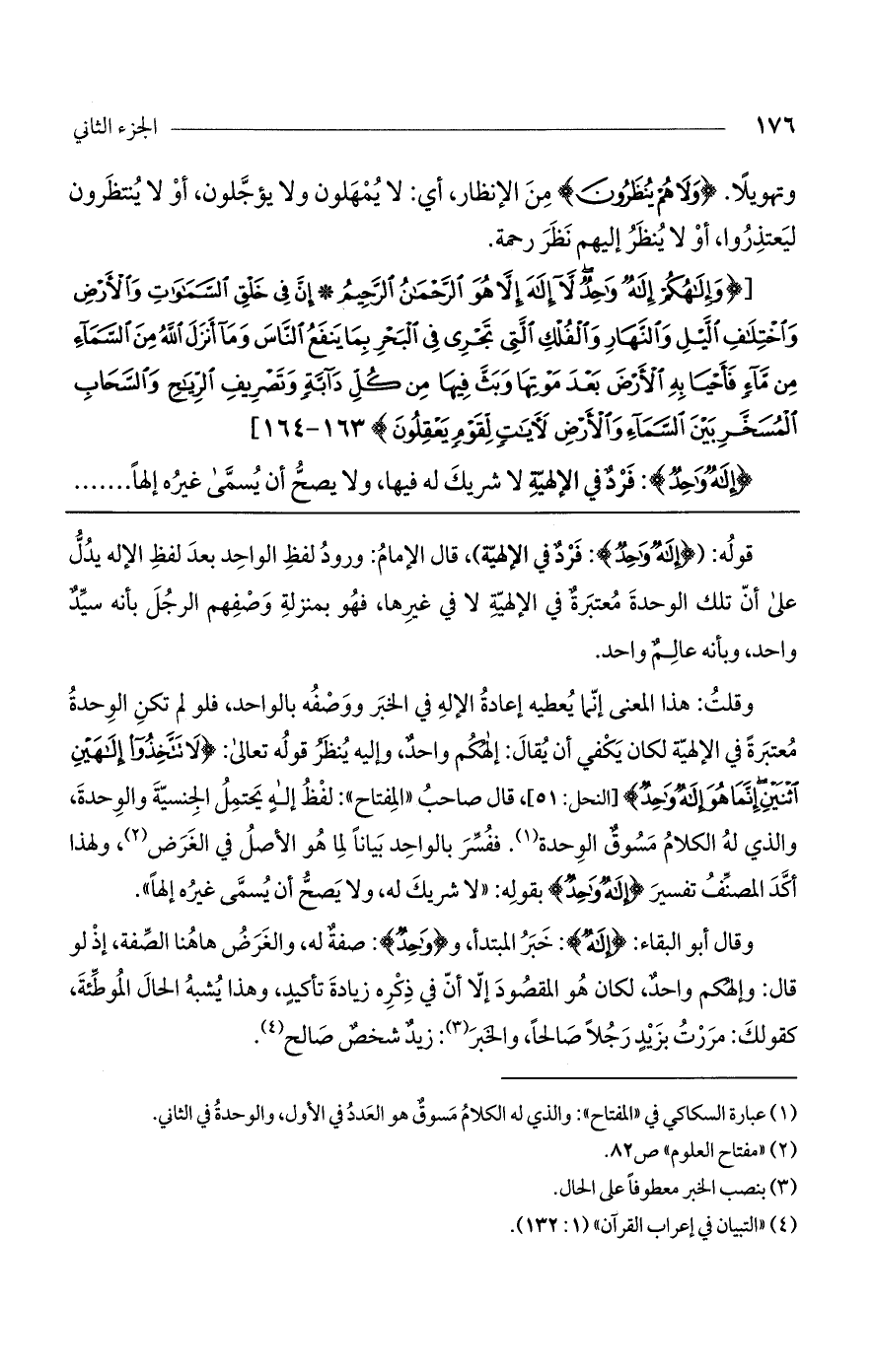 وقلت: هذا المعنى إنما يعطيه إعادة الإله في الخبر ووصفه بالواحد، فلو لم تكن الوحدة معتبرة في الإلهية لكان يكفي أن يقال: إلهكم واحد، وإليه ينظر قوله تعالى: (لا تَتَّخِذُوا إِلَهَيْنِ اثْنَيْنِ إِنَّمَا هُوَ إِلَهٌ وَاحِدٌ) [النحل: 51]، قال صاحب "المفتاح": لفظ إله يحتمل الجنسية والوحدة، والذي له الكلام مسوق الوحدة. ففسر بالواحد بياناً لما هو الأصل في الغرض، ولهذا أكد المصنف تفسير (إِلَهٌ وَاحِدٌ) بقوله: "لا شريك له، ولا يصح أن يسمى غيره إلهاً".