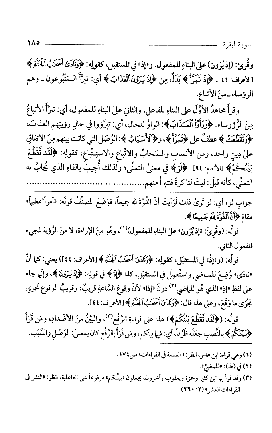 وقرأ مجاهد الأول على البناء للفاعل، والثاني على البناء للمفعول، أي: تبرأ الأتباع من الرؤساء. (وَرَأَوْا الْعَذَابَ): الواو للحال، أي: تبرؤوا في حال رؤيتهم العذاب، (وَتَقَطَّعَتْ) عطف على (تَبَرَّأَ)، و (الأَسْبَابُ): الوصل التي كانت بينهم من الاتفاق على دين واحد، ومن الأنساب والمحاب والاتباع والاستتباع، كقوله: (لَقَدْ تَقَطَّعَ بَيْنَكُمْ) [الأنعام: 94]. (لَوْ) في معنى التمني؛ ولذلك أجيب بالفاء الذي يجاب به التمني، كأنه قيل: ليت لنا كرة فنتبرأ منهم
