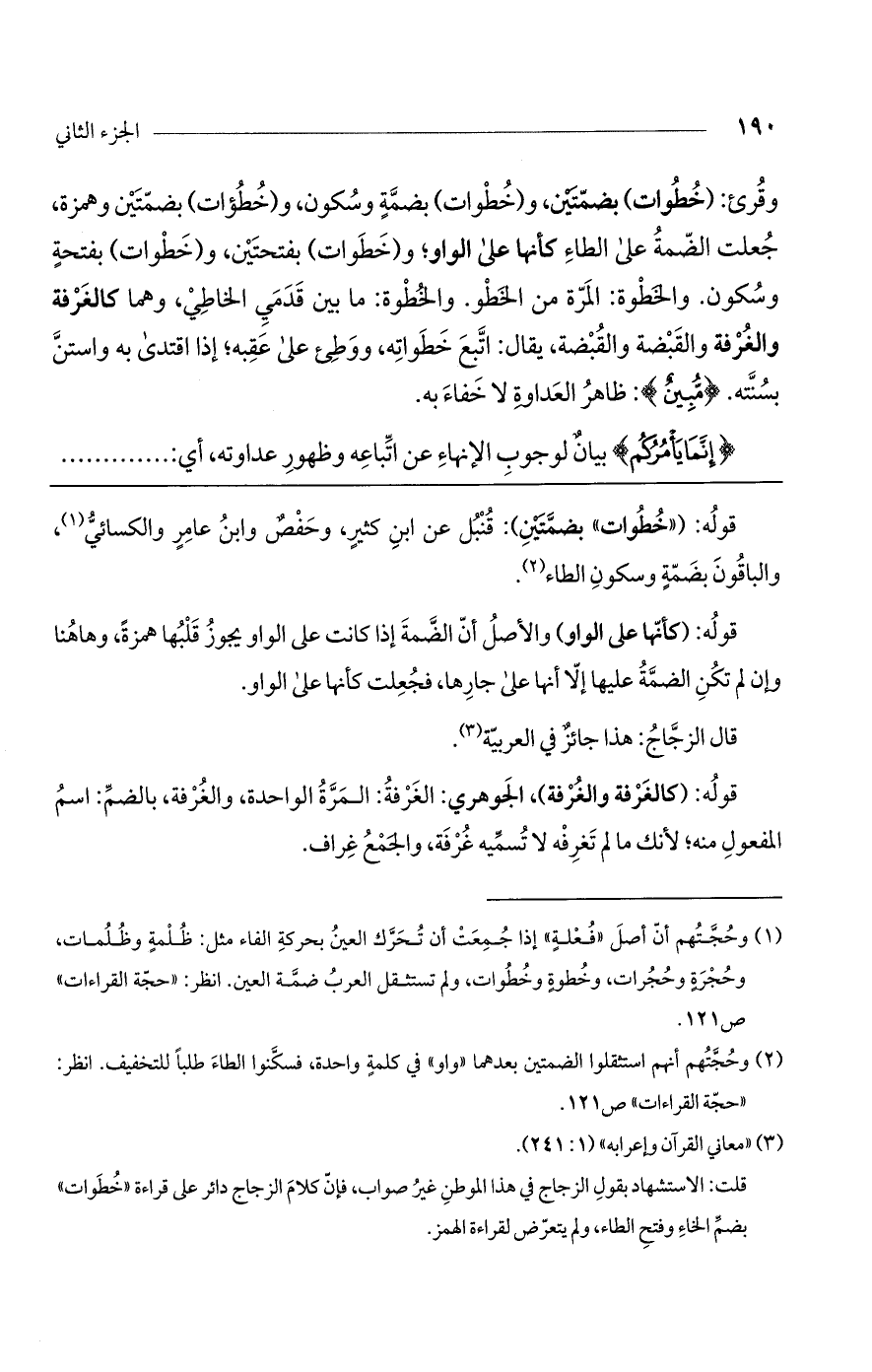 وقرئ: (خُطُوات) بضمتين، و (خُطْوات) بضمة وسكون، و (خُطؤات) بضمتين وهمزة جعلت الضمة على الطاء كأنها على الواو و (خَطَوَات) بفتحتين، و (خَطْوات) بفتحة وسكون. والخَطوة: المرة من الخطو. والخُطوة: ما بين قدمي الخاطي. وهما كالغَرفة والغُرفة، والقَبضة والقُبضة. يقال: اتبع خَطَواته، ووطئ على عقبه. إذا اقتدى به واستن بسنته (مُبِينٌ): ظاهر العداوة لا خفاء به.
