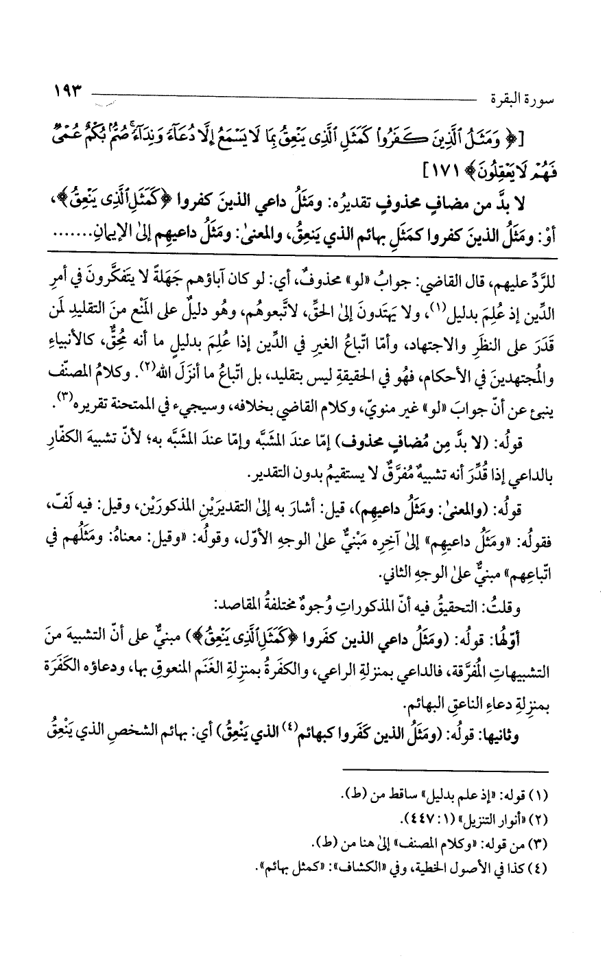 لا بدّ من مضاف محذوف تقديره. ومثل داعى الذين كفروا (كَمَثَلِ الَّذِي يَنْعِقُ)، أو: ومثل الذين كفروا كبهائم الذي ينعق. والمعنى: ومثل داعيهم إلى الإيمان ......