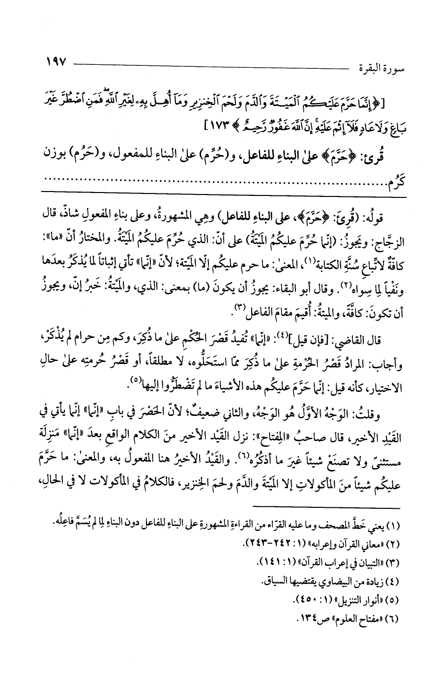 قوله: (قرئ: (حَرَّمَ)، على البناء للفاعل) وهي المشهورة، وعلى بناء المفعول شاذ، قال الزجاج: ويجوز: (إنما حرم عليكم الميتة) على أن: الذي حرم عليكم الميتة. والمختار أن "ما": كافة لاتباع سنة الكتابة، المعنى: ما حرم عليكم إلا الميتة؛ لأن "إنما" تأتي إثباتاً لما يذكر بعدها ونفياً لما سواه. وقال أبو البقاء: يجوز أن يكون (ما) بمعنى: الذي، والميتة: خبر إن، ويجوز أن تكون: كافة، والميتة: أقيم مقام الفاعل.