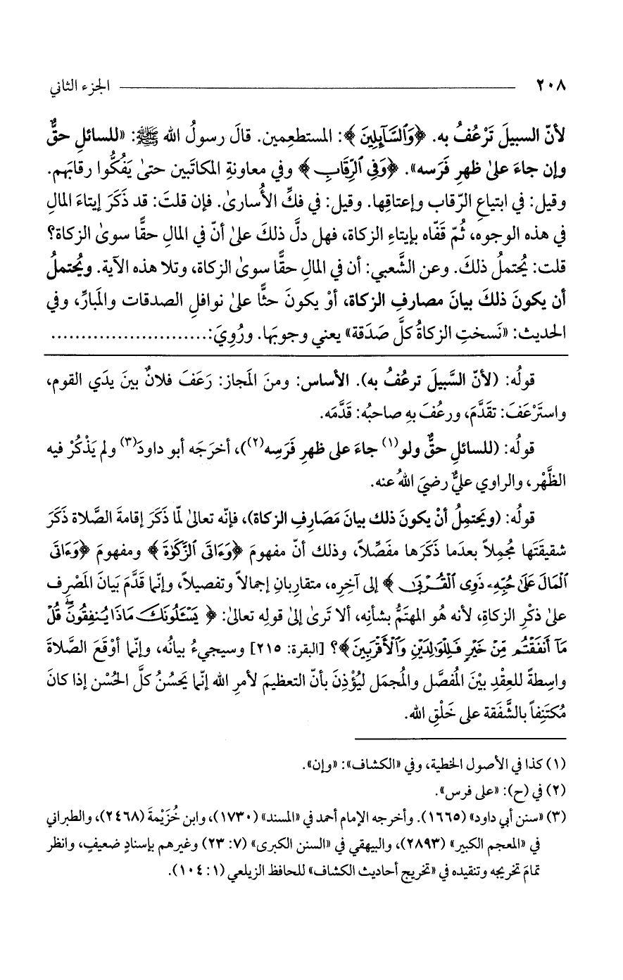 لأنّ السبيل ترعف به. (وَالسَّائِلِينَ) المستطعمين. قال رسول اللَّه صلى اللَّه عليه وسلم: "للسائل حق وإن جاء على ظهر فرسه". (وَفِي الرِّقابِ) وفي معاونة المكاتبين حتى يفكوا رقابهم. وقيل: في ابتياع الرقاب وإعتاقها. وقيل: في فك الأسارى. فإن قلت: قد ذكر إيتاء المال في هذه الوجوه، ثم قفاه بإيتاء الزكاة فهل دلّ ذلك على أنّ في المال حقا سوى الزكاة؟ قلت: يحتمل ذلك. وعن الشعبي: أنّ في المال حقاً سوى الزكاة، وتلا هذه الآية. ويحتمل أن يكون ذلك بيان مصارف الزكاة، أو يكون حثاً على نوافل الصدقات والمبارّ. وفي الحديث: «نسخت الزكاة كلَّ صدقة» يعني وجوبها. وروي ........