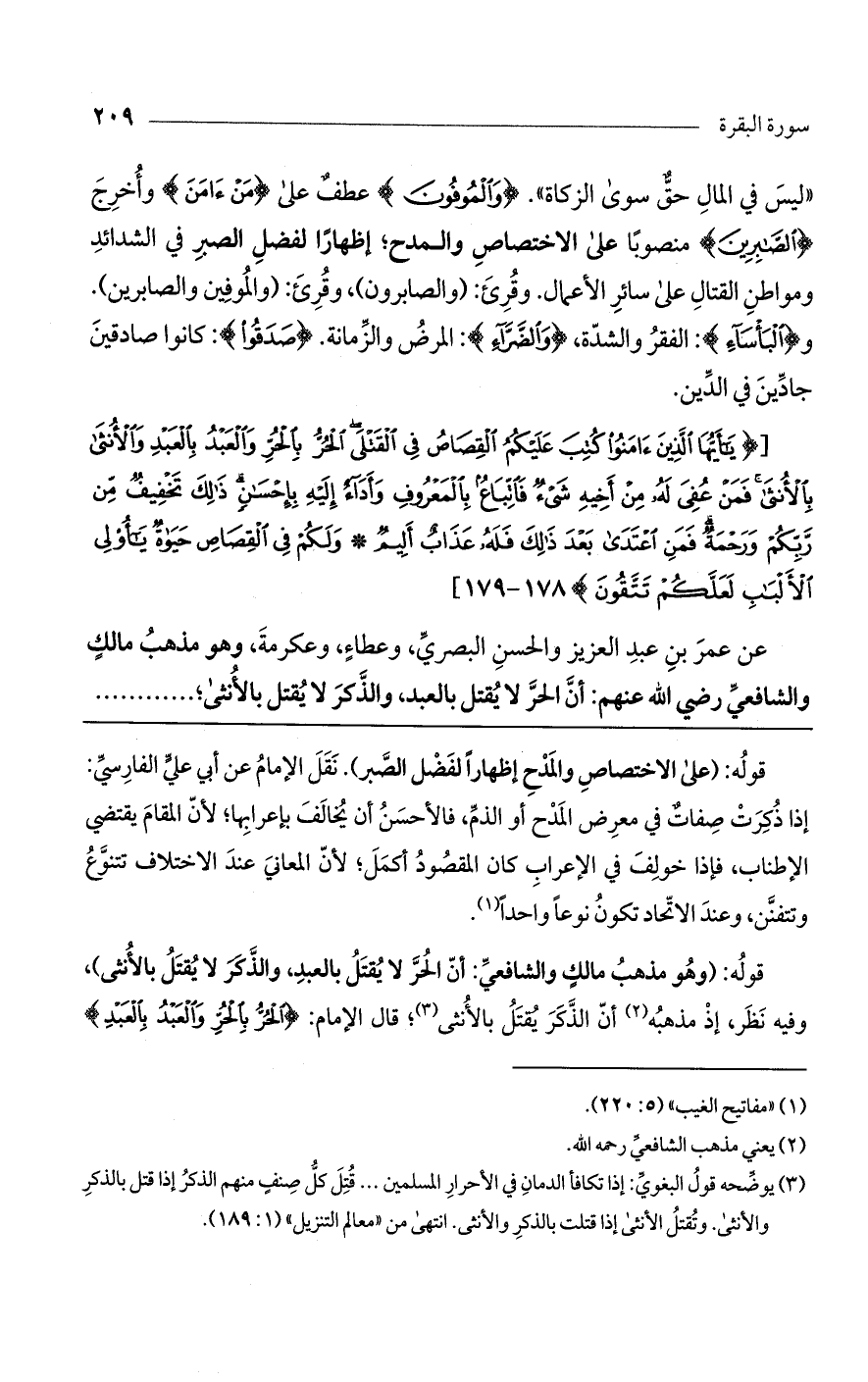 قوله: (وهو مذهب مالك والشافعي: أن الحر لا يقتل بالعبد، والذكر لا يقتل بالأنثى)، وفيه نظر، إذ مذهبه أن الذكر يقتل بالأنثى؛ قال الإمام: (الْحُرُّ بِالْحُرِّ وَالْعَبْدُ بِالْعَبْدِ)