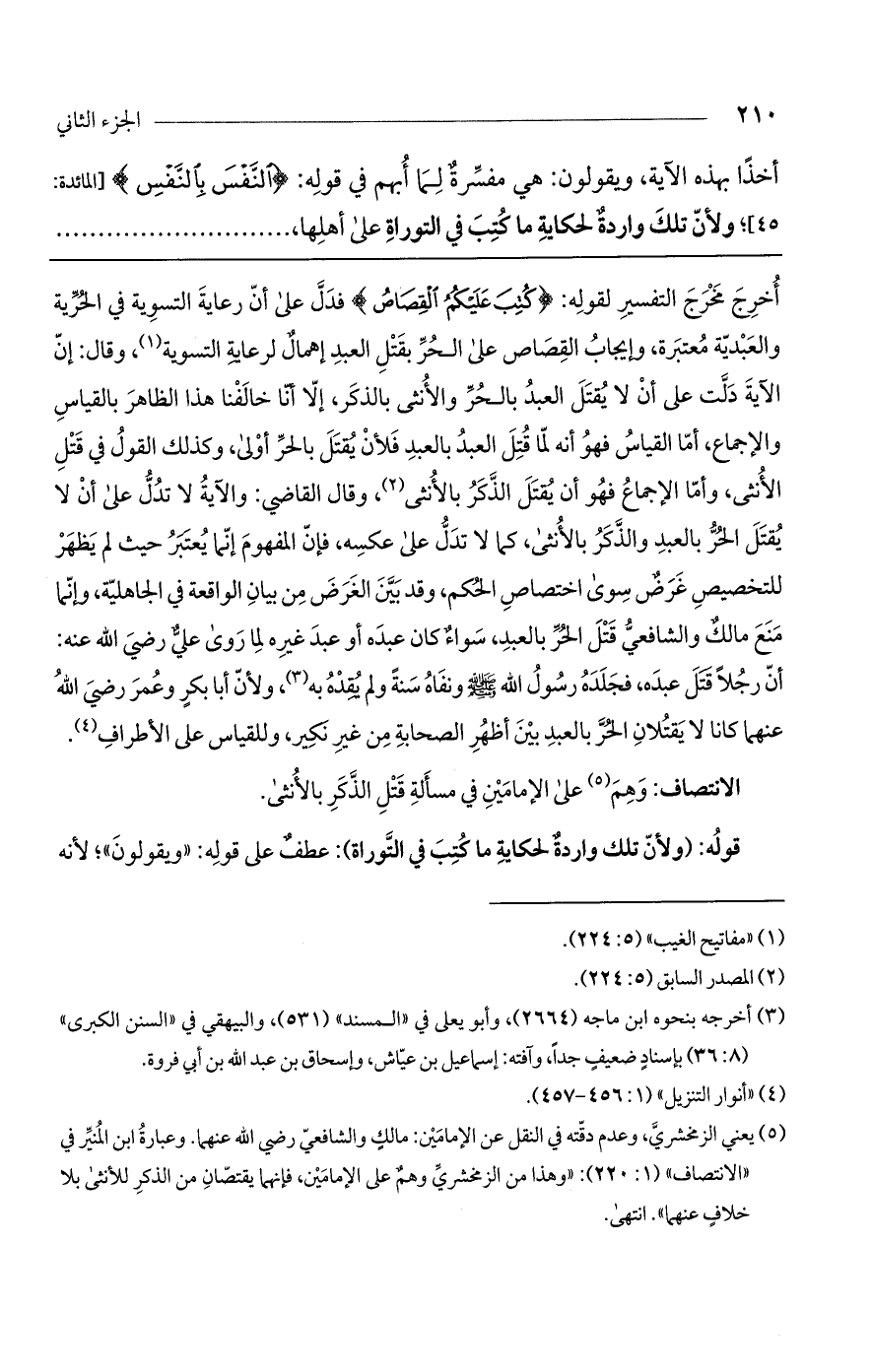 أخرج مخرج التفسير لقوله: (كُتِبَ عَلَيْكُمْ الْقِصَاصُ) فدل على أن رعاية التسوية في الحرية والعبدية معتبرة، وإيجاب القصاص على الحر بقتل العبد إهمال لرعاية التسوية، وقال: إن الآية دلت على أن لا يقتل العبد بالحر والأنثى بالذكر، إلا أنا خالفنا هذا الظاهر بالقياس والإجماع، أما القياس فهو أنه لما قتل العبد بالعبد فلأن يقتل بالحر أولى، وكذلك القول في قتل الأنثى، وأما الإجماع فهو أن يقتل الذكر بالأنثى، وقال القاضي: والآية لا تدل على أن لا يقتل الحر بالعبد والذكر بالأنثى، كما لا تدل على عكسه، فإن المفهوم إنما يعتبر حيث لم يظهر للتخصيص غرض سوى اختصاص الحكم، وقد بين الغرض من بيان الواقعة في الجاهلية، وإنما منع مالك والشافعي قتل الحر بالعبد، سواء كان عبده أو عبد غيره لما روى علي رضي الله عنه: أن رجلاً قتل عبده، فجلده رسول الله صلى الله عليه وسلم ونفاه سنة ولم يقده به، ولأن أبا بكر وعمر رضي الله عنهما كانا لا يقتلان الحر بالعبد بين أظهر الصحابة من غير نكير، وللقياس على الأطراف.