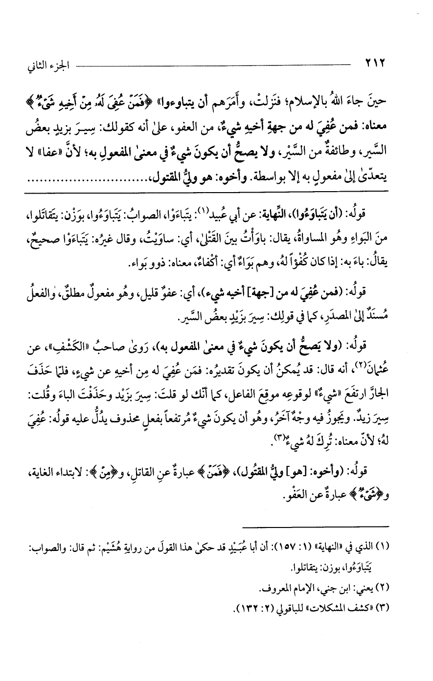 حين جاء اللَّه بالإسلام؛ فنزلت، وأمرهم أن يتباوؤا" (فَمَنْ عُفِيَ لَهُ مِنْ أَخِيهِ شَيْءٌ) معناه: فمن عفي له من جهة أخيه شيء، من العفو، على أنه كقولك: سير بزيد بعض السير، وطائفة من السير، ولا يصح أن يكون شيء في معنى المفعول به؛ لأن «عفا» لا يتعدّى إلى مفعول به إلا بواسطة. وأخوه: هو وليّ المقتول