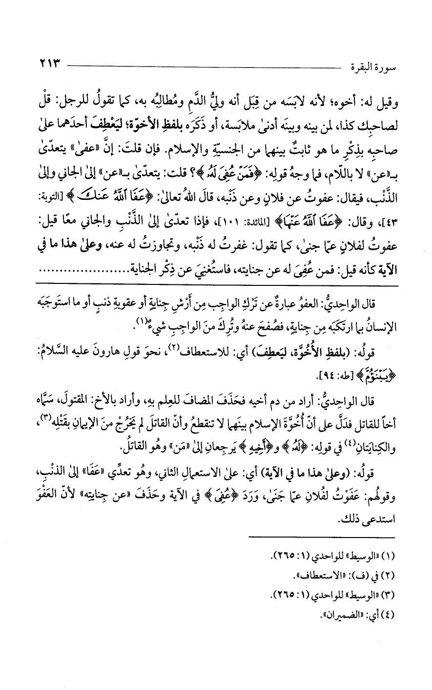 وقيل له: أخوه؛ لأنه لابسه من قِبَل أنه ولى الدم ومطالبه به، كما تقول للرجل: قل لصاحبك كذا، لمن بينه وبينه أدنى ملابسة، أو ذكره بلفظ الأخوة؛ ليعطف أحدهما على صاحبه بذكر ما هو ثابت بينهما من الجنسية والإسلام. فإن قلت: إن "عفى" يتعدّى بـ"عن" لا باللام، فما وجه قوله: (فَمَنْ عُفِيَ لَهُ)؟ قلت: يتعدى بـ"عن" إلى الجاني وإلى الذنب، فيقال: عفوت عن فلان وعن ذنبه. قال اللَّه تعالى: (عَفَا اللَّهُ عَنْكَ) [التوبة: 43]، وقال: (عَفَا اللَّهُ عَنْها) [المائدة: 101]، فإذا تعدّى إلى الذنب والجاني معاً قيل: عفوت لفلان عما جنى، كما تقول: غفرت له ذنبه، وتجاوزت له عنه، وعلى هذا ما في الآية كأنه قيل: فمن عُفيَ له عن جنايته، فاستغنى عن ذكر الجناية ......
