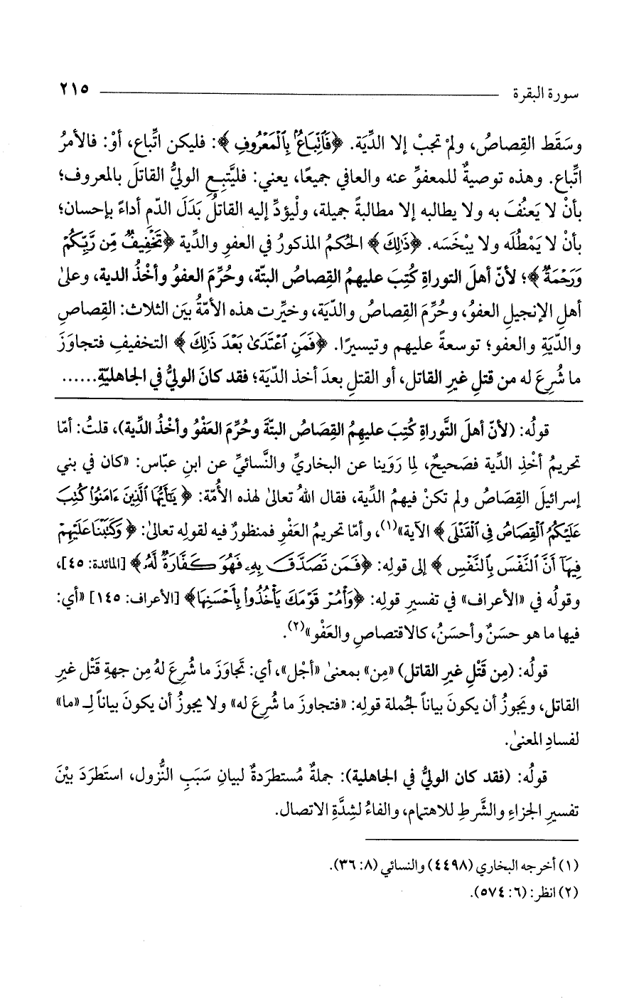 قوله: (لأن أهل التوراة كتب عليهم القصاص البتة وحرم العفو وأخذ الدية)، قلت: أما تحريم أخذ الدية فصحيح، لما روينا عن البخاري والنسائي عن ابن عباس: "كان في بني إسرائيل القصاص ولم تكن فيهم الدية، فقال الله تعالى لهذه الأمة: (يَا أَيُّهَا الَّذِينَ آمَنُوا كُتِبَ عَلَيْكُمْ الْقِصَاصُ فِي الْقَتْلَى) الآية"، وأما تحريم العفو فمنظور فيه لقوله تعالى: (وَكَتَبْنَا عَلَيْهِمْ فِيهَا أَنَّ النَّفْسَ بِالنَّفْسِ) إلى قوله: (فَمَنْ تَصَدَّقَ بِهِ فَهُوَ كَفَّارَةٌ لَهُ) [المائدة: 45]، وقوله في "الأعراف" في تفسير قوله: (وَامُرْ قَوْمَكَ يَاخُذُوا بِأَحْسَنِهَا) [الأعراف: 145] "أي: فيها ما هو حسن وأحسن، كالاقتصاص والعفو".