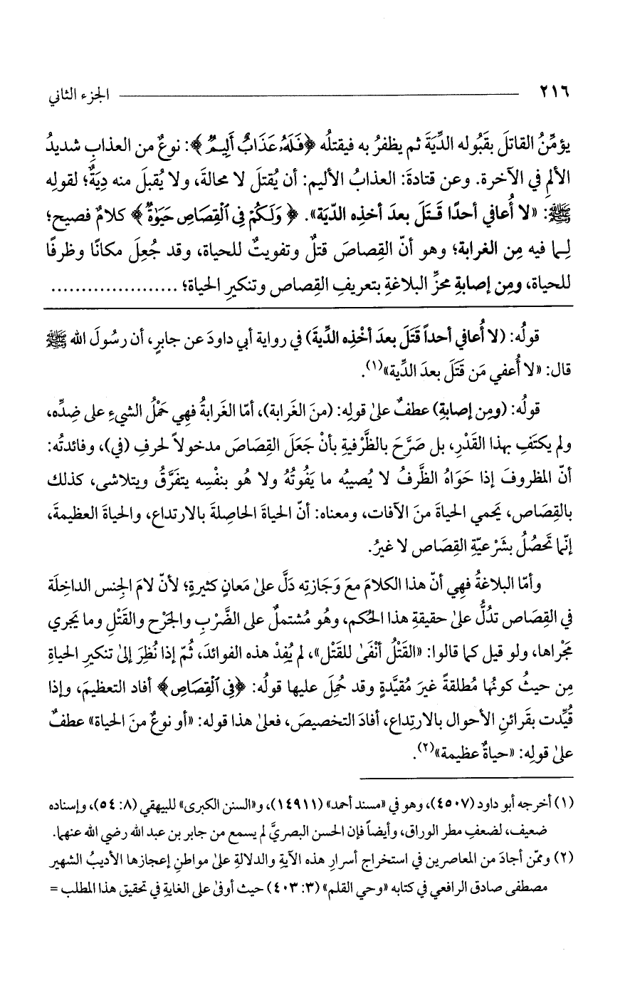 وأما البلاغة فهي أن هذا الكلام مع وجازته دل على معان كثيرة؛ لأن لام الجنس الداخلة في القصاص تدل على حقيقة هذا الحكم، وهو مشتمل على الضرب والجرح والقتل وما يجري مجراها، ولو قيل كما قالوا: "القتل أنفى للقتل"، لم يفد هذه الفوائد، ثم إذا نظر إلى تنكير الحياة من حيث كونها مطلقة غير مقيدة وقد حمل عليها قوله: (فِي الْقِصَاصِ) أفاد التعظيم، وإذا قيدت بقرائن الأحوال بالارتداع، أفاد التخصيص، فعلى هذا قوله: "أو نوع من الحياة" عطف على قوله: "حياة عظيمة".