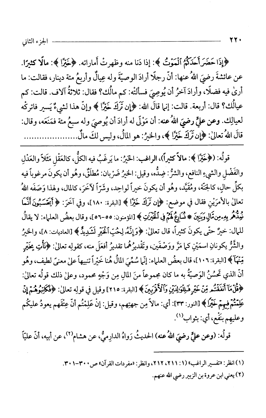 قوله: ((خَيْراً): مالاً كثيراً)، الراغب: الخير: ما يرغب فيه الكل، كالعقل مثلاً والعدل والفضل والشيء النافع، والشر: ضده، وقيل: الخير ضربان: مطلق، وهو أن يكون مرغوباً فيه بكل حال، كالجنة، ومقيد، وهو أن يكون خيراً لواحد، وشراً لآخر، كالمال، ولهذا وصفه الله تعالى بالأمرين فقال في موضع: (إِنْ تَرَكَ خَيْراً) [البقرة: 180]، وفي آخر: (أَيَحْسَبُونَ أَنَّمَا نُمِدُّهُمْ بِهِ مِنْ مَالٍ وَبَنِينَ* نُسَارِعُ لَهُمْ فِي الْخَيْرَاتِ) [المؤمنون: 55 - 56]، وقال بعض العلماء: لا يقال للمال: خير حتى يكون كثيراً، قال تعالى: (وَإِنَّهُ لِحُبِّ الْخَيْرِ لَشَدِيدٌ) [العاديات: 8]، والخير والشر يكونان اسمين كما مر ووصفين، وتقديرهما تقدير أفعل منه، كقوله تعالى: (نَاتِ بِخَيْرٍ مِنْهَا) [البقرة: 106]، قال بعض العلماء: إنما سمي المال هنا خيراً تنبيهاً على معنى لطيف، وهو أن الذي تحسن الوصية به ما كان مجموعاً من المال من وجه محمود، وعلى ذلك قوله تعالى: (قُلْ مَا أَنفَقْتُمْ مِنْ خَيْرٍ فَلِلْوَالِدَيْنِ وَالأَقْرَبِينَ) [البقرة: 215] وقيل في قوله تعالى: (فَكَاتِبُوهُمْ إِنْ عَلِمْتُمْ فِيهِمْ خَيْراً) [النور: 33] أي: مالاً من جهتهم، وقيل: إن علمتم أن عتقهم يعود عليكم وعليهم بنفع، أي: بثواب.