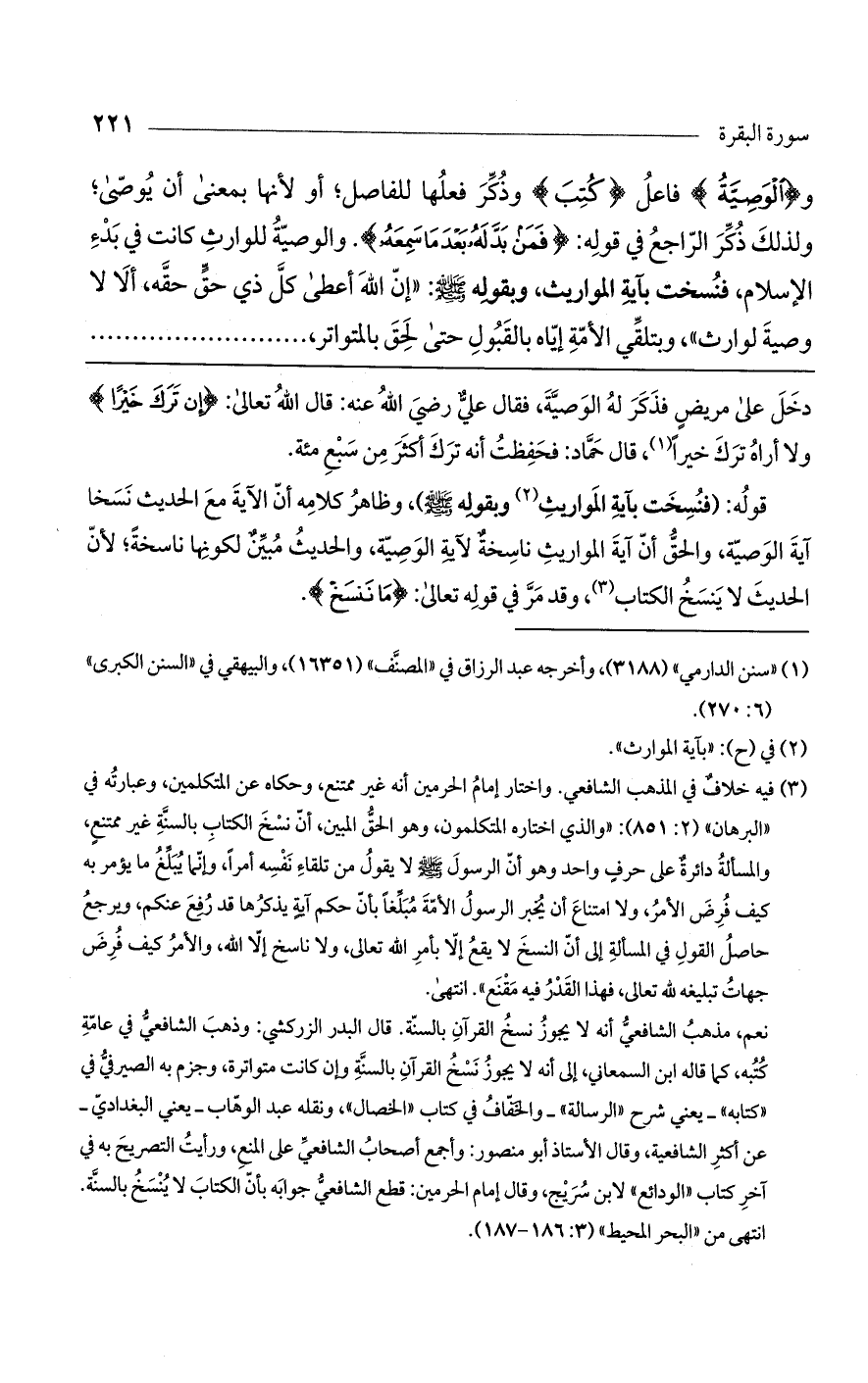 و (الوصية) فاعل (كتب)، وذكر فعلها للفاصل؛ أو لأنها بمعنى أن يوصى، ولذلك ذكر الراجع في قوله: (فَمَنْ بَدَّلَهُ بَعْدَ ما سَمِعَهُ). والوصية للوارث كانت في بدء الإسلام، فنسخت بآية المواريث، وبقوله صلى الله عليه وسلم: «إنّ اللَّه أعطى كلّ ذي حق حقه، ألا لا وصية لوارث. وبتلقى الأمّة إياه بالقبول حتى لحق بالمتواتر