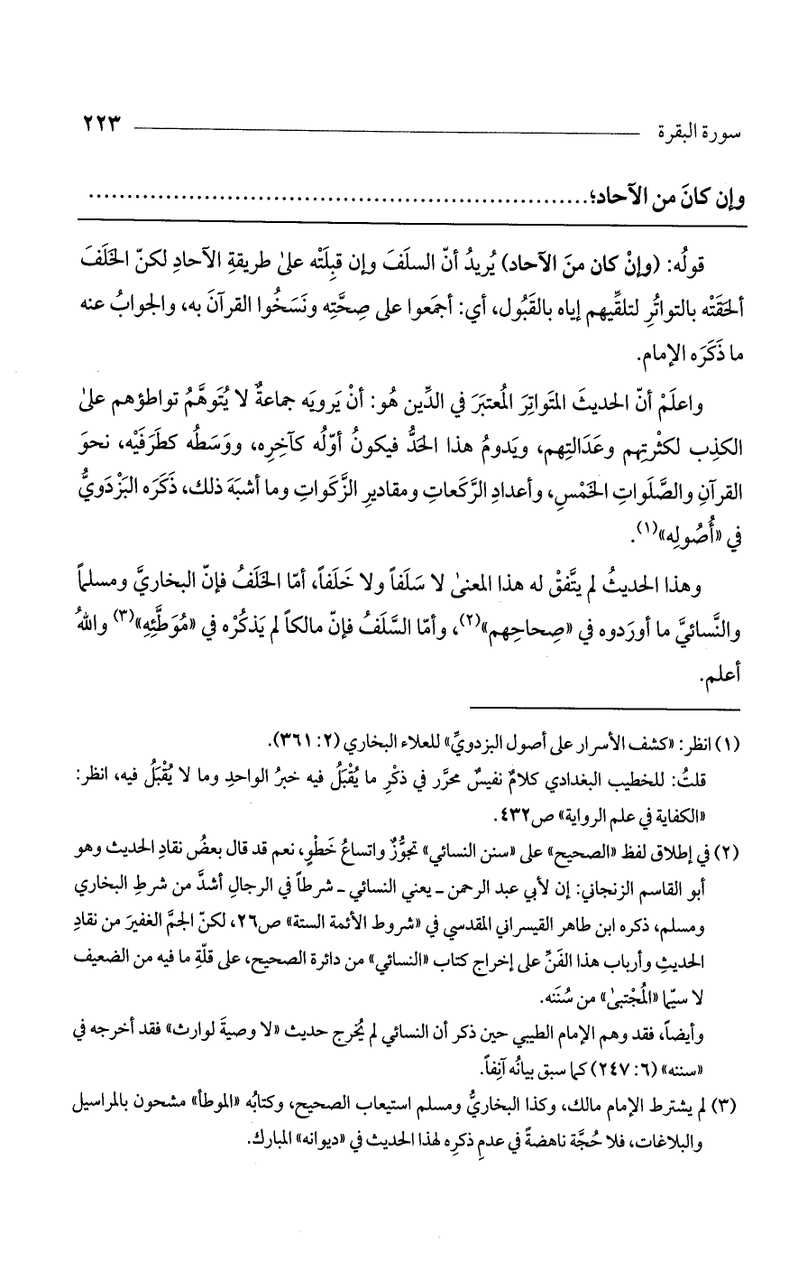 واعلم أن الحديث المتواتر المعتبر في الدين هو: أن يرويه جماعة لا يتوهم تواطؤهم على الكذب لكثرتهم وعدالتهم، ويدوم هذا الحد فيكون أوله كآخره، ووسطه كطرفيه، نحو القرآن والصلوات الخمس، وأعداد الركعات ومقادير الزكوات وما أشبه ذلك، ذكره البزدوي في "أصوله".