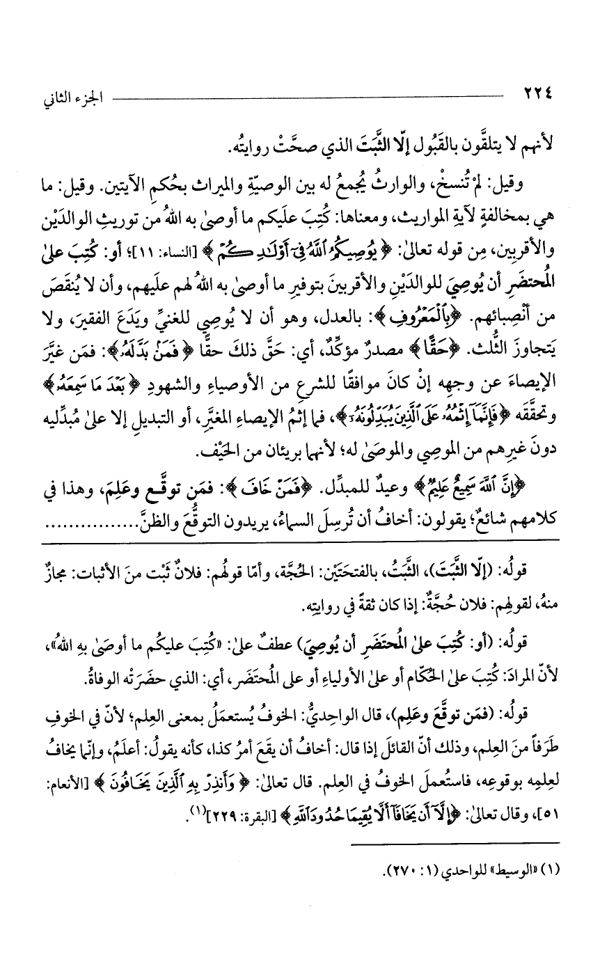 ومعناها: كتب عليكم ما أوصى به اللَّه من توريث الوالدين والأقربين من قوله تعالى: (يُوصِيكُمُ اللَّهُ فِي أَوْلادِكُمْ) [النساء: 11]؛ أو: كتب على المحتضر أن يوصى للوالدين والأقربين بتوفير ما أوصى به اللَّه لهم عليهم، وأن لا ينقص من أنصبائهم (بِالْمَعْرُوفِ): بالعدل، وهو أن لا يوصى للغنى ويدع الفقير، ولا يتجاوز الثلث. (حَقًّا) مصدر مؤكد، أي: حق ذلك حقاً (فَمَنْ بَدَّلَهُ): فمن غير الإيصاء عن وجهه إن كان موافقاً للشرع من الأوصياء والشهود (بَعْدَ ما سَمِعَهُ) وتحققه (فَإِنَّما إِثْمُهُ عَلَى الَّذِينَ يُبَدِّلُونَهُ) فما إثم الإيصاء المغير أو التبديل إلا على مبدّليه دون غيرهم من الموصى والموصى له، لأنهما بريئان من الحيف.