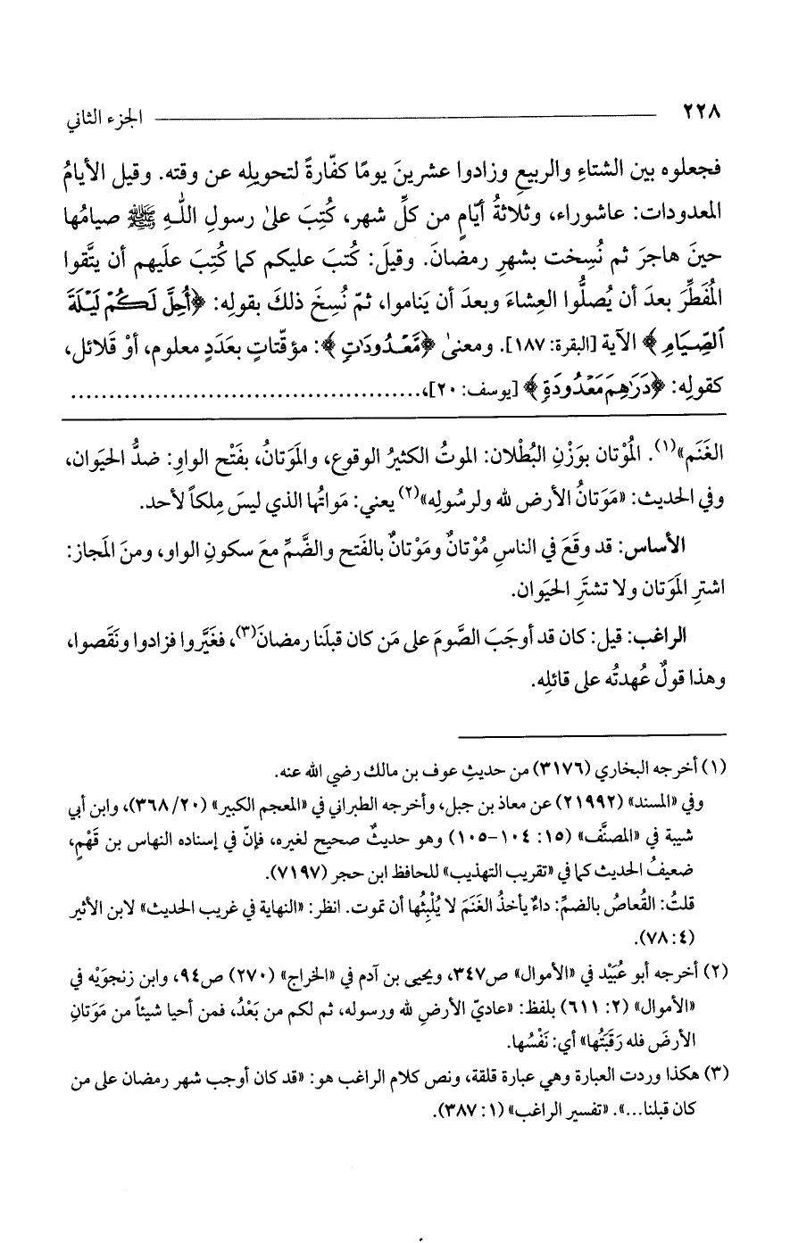 الغنم". الموتان بوزن البطلان: الموت الكثير الوقوع، والموتان، بفتح الواو: ضد الحيوان، وفي الحديث: "موتان الأرض لله ولرسوله" يعني: مواتها الذي ليس ملكاً لأحد.