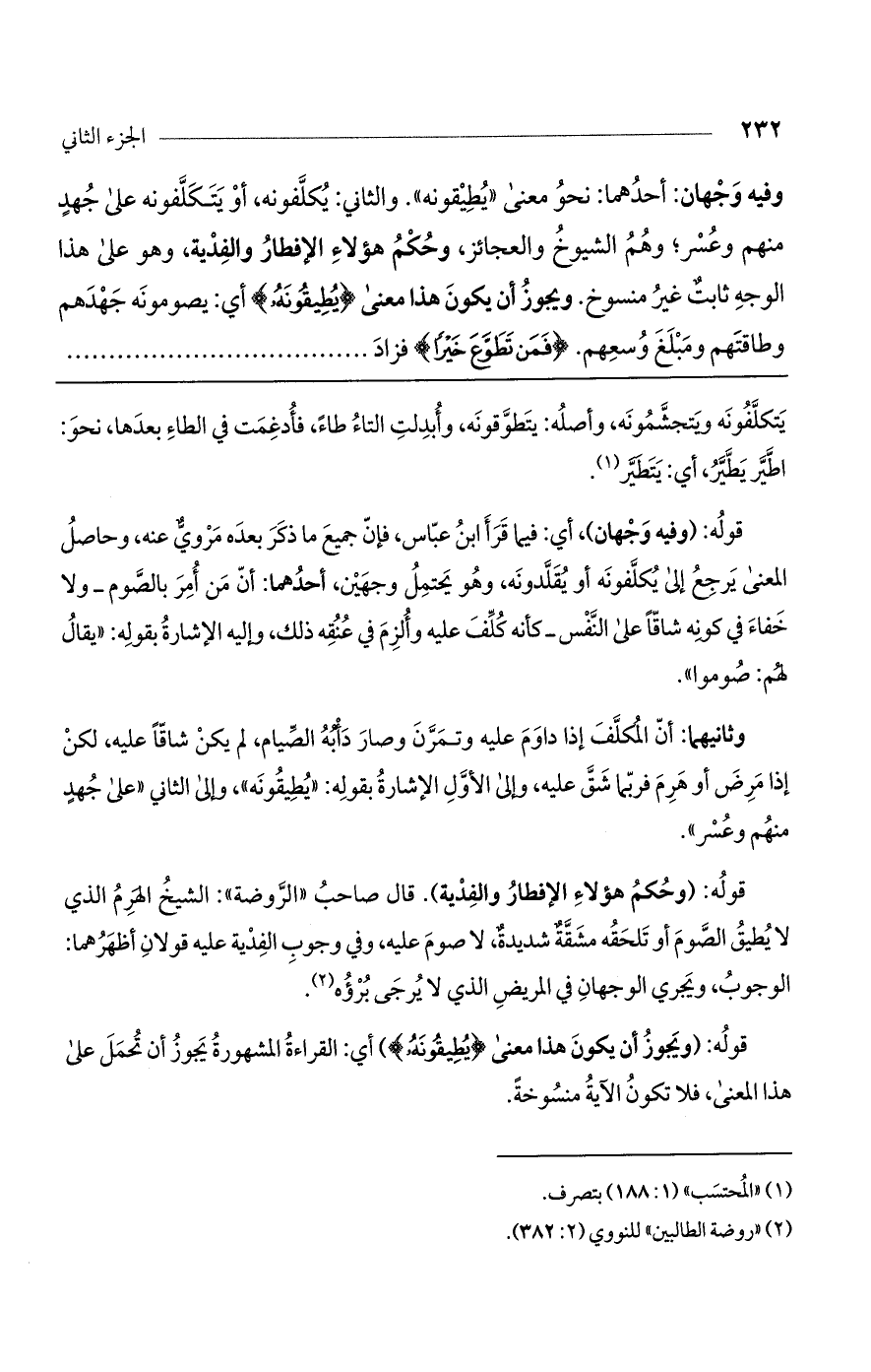 وفيه وجهان: أحدهما نحو معنى يطيقونه. والثاني يكلفونه أو يتكلفونه على جهد منهم وعسر وهم الشيوخ والعجائز، وحكم هؤلاء الإفطار والفدية، وهو على هذا الوجه ثابت غير منسوخ. ويجوز أن يكون هذا معنى (يطيقونه) أي: يصومونه جهدهم وطاقتهم ومبلغ وسعهم. (فَمَنْ تَطَوَّعَ خَيْراً) فزاد .......