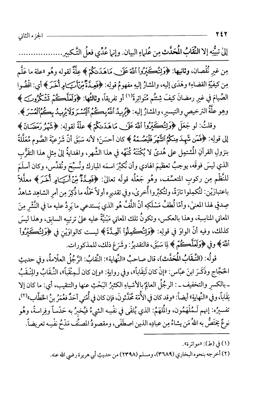 وقلت: لو جعل (وَلِتُكَبِّرُوا اللَّهَ عَلَى مَا هَدَاكُمْ) علة لقوله: (شَهْرُ رَمَضَانَ) إلى قوله: (فَمَنْ شَهِدَ مِنْكُمْ الشَّهْرَ فَلْيَصُمْهُ) كان أحسن؛ لأنه سبق أن شرعية الصوم معللة بنزول القرآن المشتمل على هدى لا يكتنه كنهه في هذا الشهر، والهداية إلى مثل هذا التقرب الذي ليس فوقه، يوجب تعظيم الهادي وأن نكبر اسمه المبارك ونسبح ونقدس، وكان أسلم للنظم من ركوب المتعسف، وهو جعله قوله تعالى: (فَعِدَّةٌ مِنْ أَيَّامٍ أُخَرَ) معللاً باعتبارين: لتكملوا تارة، ولتكبروا أخرى، وفي تقديره أولاً حمله ما ذكره من أمر الشاهد شاهد صدق لهذا المعنى، وأما لطف مسلكه أن اللف هو الذي يستدعي ما يرد عليه ما في النشر من المعاني المناسبة، وهذا بالعكس، وتكون تلك المعاني مبنية عليه على ترتيبه السابق، وهذا ليس كذلك، وفيه أن الواو في قوله: (وَلِتُكْمِلُوا الْعِدَّةَ) ليست كالواوين في (وَلِتُكَبِّرُوا اللَّهَ) وفي (وَلِتُكَبِّرُوا اللَّهَ) وفي (وَلَعَلَّكُمْ) لما سبق، فالتقدير: وشرع ذلك، للمذكورات.