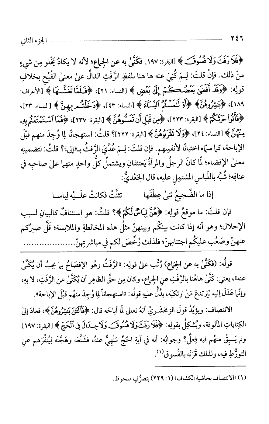 (فلا رفث ولا فسوق) [البقرة: 197] فكنى به عن الجماع، لأنه لا يكاد يخلو من شيءٍ من ذلك. فإن قلت: لم كني عنه هاهنا بلفظ الرفث الدال على معنى القبح بخلاف قوله: (وَقَدْ أَفْضى بَعْضُكُمْ إِلى بَعْضٍ) [النساء: 21]، (فَلَمَّا تَغَشَّاها) [الأعراف: 189]، (بَاشِرُوهُنَّ) (أَوْ لامَسْتُمُ النِّساءَ) [النساء: 43]، (دَخَلْتُمْ بِهِنَّ) [النساء: 23]، (فَاتُوا حَرْثَكُمْ) [البقرة: 223]، (مِنْ قَبْلِ أَنْ تَمَسُّوهُنَّ) [البقرة: 237]، (فَمَا اسْتَمْتَعْتُمْ بِهِ مِنْهُنَّ) [البقرة: 223]، (وَلا تَقْرَبُوهُنَّ) [البقرة: 222]؟ قلت: استهجاناً لما وجد منهم قبل الإباحة، كما سماه اختيانا لأنفسهم. فإن قلت: لم عدي الرفث بـ"إلى"؟ قلت: لتضمينه معنى الإفضاء. لما كان الرجل والمرأة يعتنقان ويشتمل كل واحد منهما على صاحبه في عناقه؛ شبه باللباس المشتمل عليه. قال الجعدي: