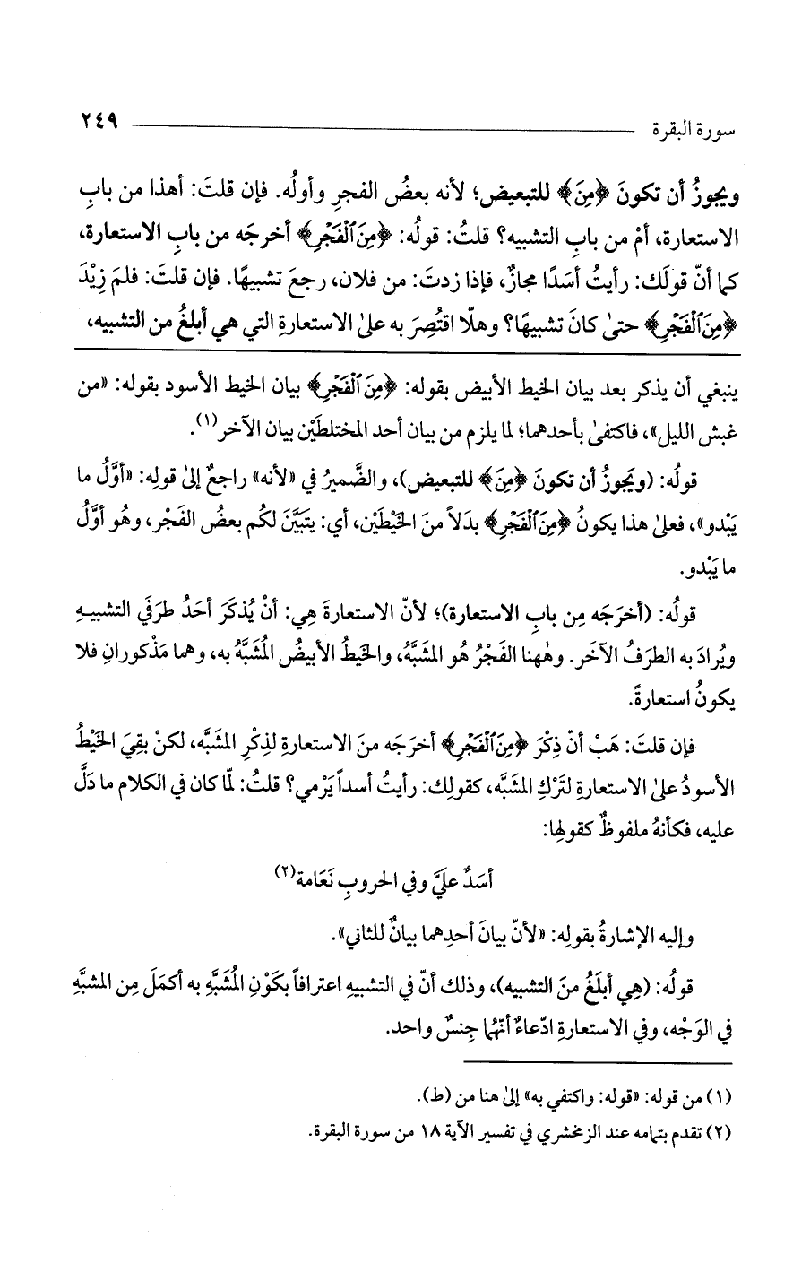 ويجوز أن تكون «من» للتبعيض؛ لأنه بعض الفجر وأوّله. فإن قلت: أهذا من باب الاستعارة أم من باب التشبيه؟ قلت: قوله: (مِنَ الْفَجْرِ) أخرجه من باب الاستعارة، كما أن قولك: رأيت أسداً مجاز. فإذا زدت «من فلان» رجع تشبيها. فإن قلت: فلم زيد (مِنَ الْفَجْرِ) حتى كان تشبيها؟ وهلا اقتصر به على الاستعارة التي هي أبلغ من التشبيه
