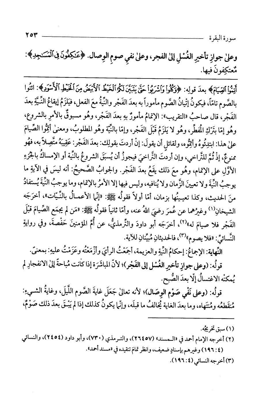 أَتِمُّوا الصِّيَامَ) بعد قوله: (وَكُلُوا وَاشْرَبُوا حَتَّى يَتَبَيَّنَ لَكُمْ الْخَيْطُ الأَبْيَضُ مِنْ الْخَيْطِ الأَسْوَدِ): ائتوا بالصوم تاماً، فيكون إتيان الصوم مأموراً به بعد الفجر والنية مع الفعل، فيلزم إيقاع النية بعد الفجر، قال صاحب "التقريب": الإتمام مأمور به بعد الفجر، وهو مسبوق بالأمر بالشروع، وهو إما بترك المفطر، وهو لا يلزم قبل الفجر، وإما بالنية وهو المطلوب، ومعنى أتموا الصيام على هذا: ابتدئوه وأتموه، ولقائل أن يقول: إن أردت بقولك: بعد الفجر: عقيبه متصلاً به، فهو ممنوع، إذ ثم للتراخي، وإن أردت التراخي فيجوز أن يسبق الشروع بالنية أو الإمساك بالجزء الأول على الإتمام، وهو مع ذلك يقع بعد الفجر. والجواب الصحيح: أنه ليس في الآية ما يوجب النية ولا تعيين الزمان ولا ينافيه، وليس فيها إلا الأمر بالإتمام، وما يوجب النية يستفاد من الحديث، وكذا تعيينها بزمان، أما أولاً فقوله صلى الله عليه وسلم: "إنما الأعمال بالنيات"، أخرجه الشيخان وغيرهما عن عمر رضي الله عنه، وأما ثانياً فقوله صلى الله عليه وسلم: "من لم يجمع الصيام قبل الفجر فلا صيام له"، أخرجه أبو داود والترمذي، عن أم المؤمنين حفصة، وفي رواية النسائي: "فلا يصوم"، فالحديثان مبينان للآية.