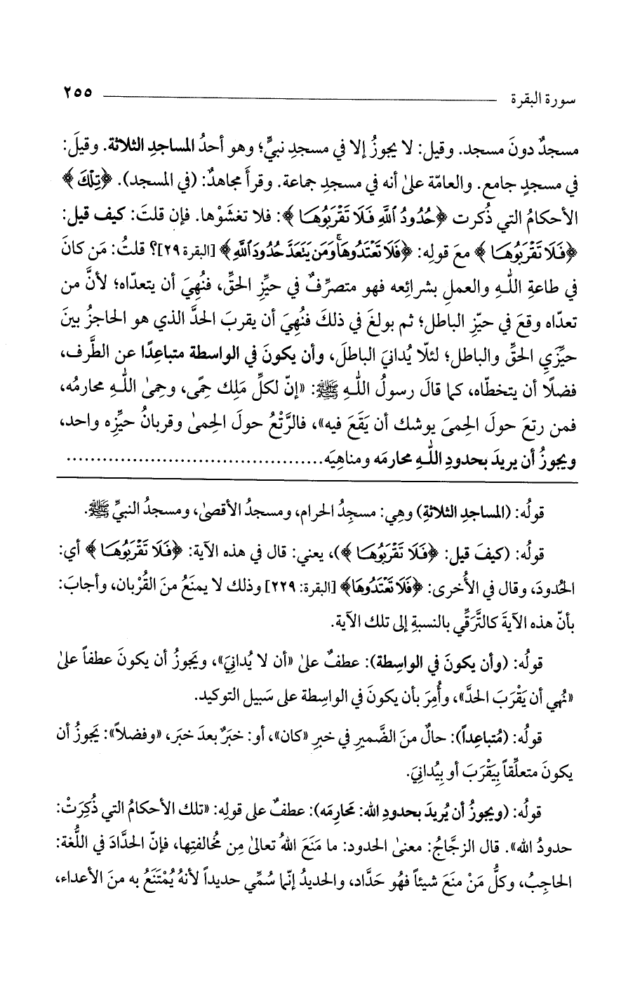 قوله: (ويجوز أن يريد بحدود الله: محارمه): عطف على قوله: "تلك الأحكام التي ذكرت: حدود الله". قال الزجاج: معنى الحدود: ما منع الله تعالى من مخالفتها، فإن الحداد في اللغة: الحاجب، وكل من منع شيئاً فهو حداد، والحديد إنما سمي حديداً لأنه يمتنع به من الأعداء،