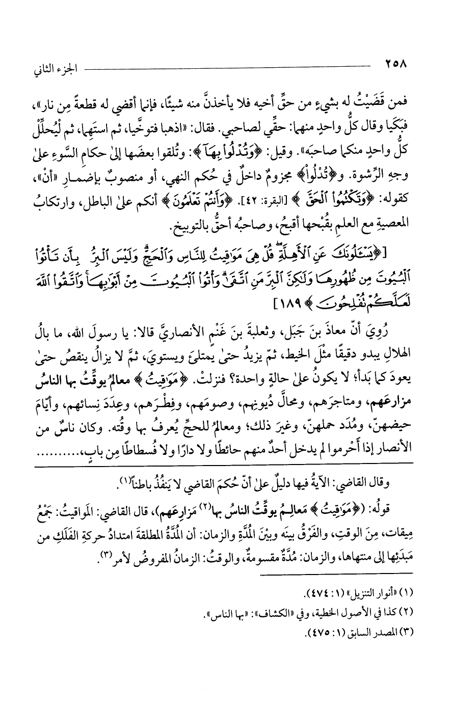 روي أن معاذ بن جبل، وثعلبة بن غنم الأنصارى قالا: يا رسول اللَّه، ما بال الهلال يبدو دقيقاً مثل الخيط، ثم يزيد حتى يمتلئ ويستوي، ثم لا يزال ينقص حتى يعود كما بدأ؛ لا يكون على حالة واحدة؟ فنزلت (مَواقِيتُ) معالم يوقت بها الناس مزارعهم، ومتاجرهم، ومحال ديونهم، وصومهم، وفطرهم، وعدد نسائهم، وأيام حيضهنّ، ومدد حملهنّ، وغير ذلك؛ ومعالم للحج يعرف بها وقته. كان ناس من الأنصار إذا أحرموا لم يدخل أحد منهم حائطاً ولا داراً ولا فسطاطاً من باب، .....