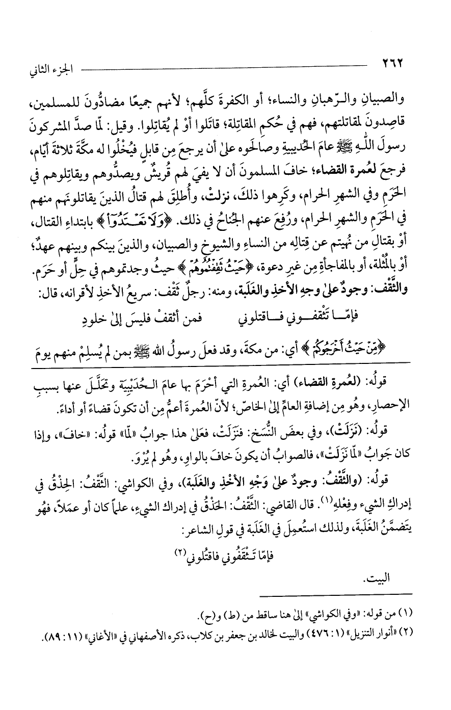 والصبيان والرهبان والنساء؛ أو الكفرة كلهم؛ لأنهم جميعاً مضادّون للمسلمين، قاصدون لمقاتلتهم، فهم في حكمٍ المقاتلة، قاتلوا أو لم يقاتلوا. وقيل: لما صدّ المشركون رسول اللَّه صلى اللَّه عليه وسلم عام الحديبية وصالحوه على أن يرجع من قابل فيخلوا له مكة ثلاثة أيام، فرجع لعمرة القضاء؛ خاف المسلمون أن لا يفي لهم قريش ويصدّوهم ويقاتلوهم في الحرم وفي الشهر الحرام، وكرهوا ذلك، نزلت، وأطلق لهم قتال الذين يقاتلونهم منهم في الحرم والشهر الحرام، ورفع عنهم الجناح في ذلك. (وَلا تَعْتَدُوا) بابتداء القتال، أو بقتال من نهيتم عن قتاله من النساء والشيوخ والصبيان، والذين بينكم وبينهم عهد أو بالمثلة، أو بالمفاجأة من غير دعوة، (حَيْثُ ثَقِفْتُمُوهُمْ) حيث وجدتموهم في حل أو حرم. والثقف: وجود على وجه الأخذ والغلبة. ومنه: رجل ثقف، سريع الأخذ لأقرانه. قال: