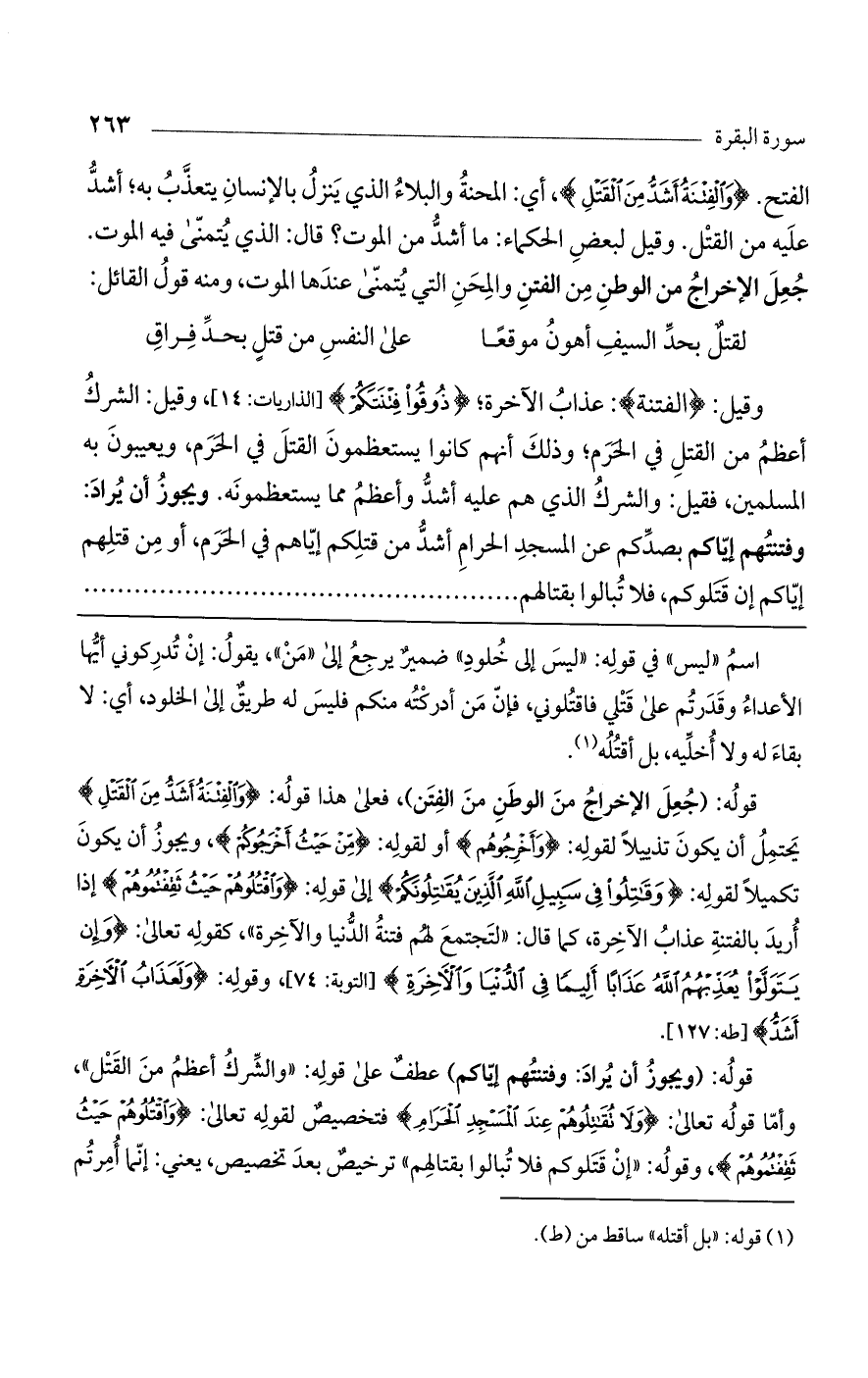 قوله: 0 جعل الإخراج من الوطن من الفتن)، فعلى هذا قوله: (وَالْفِتْنَةُ أَشَدُّ مِنْ الْقَتْلِ) يحتمل أن يكون تذييلاً لقوله: (وَأَخْرِجُوهُمْ) أو لقوله: (مِنْ حَيْثُ أَخْرَجُوكُمْ)، ويجوز أن يكون تكميلاً لقوله: (وَقَاتِلُوا فِي سَبِيلِ اللَّهِ الَّذِينَ يُقَاتِلُونَكُمْ) إلى قوله: (وَاقْتُلُوهُمْ حَيْثُ ثَقِفْتُمُوهُمْ) إذا أريد بالفتنة عذاب الآخرة، كما قال: "لتجتمع لهم فتنة الدنيا والآخرة"، كقوله تعالى: (وَإِنْ يَتَوَلَّوْا يُعَذِّبْهُمْ اللَّهُ عَذَاباً أَلِيماً فِي الدُّنْيَا وَالآخِرَةِ) [التوبة: 74]، وقوله: (وَلَعَذَابُ الآخِرَةِ أَشَدُّ) [طه: 127].
