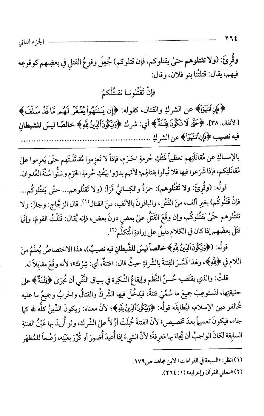 قوله: (وقرئ: ولا تقتلوهم): حمزة والكسائي قرآ: 0 ولا تقتلوهم ... حتى يقتلوكم ... فإن قتلوكم) بغير ألف، من القتل، والباقون بالألف، من القتال. قال الزجاج: وجاز: ولا تقتلوهم حتى يقتلوكم، وإن وقع القتل على بعض دون بعض، فإنه يقال: قتلت القوم، وإنما قتل بعضهم إذا كان في الكلام دليل على إرادة المتكلم.