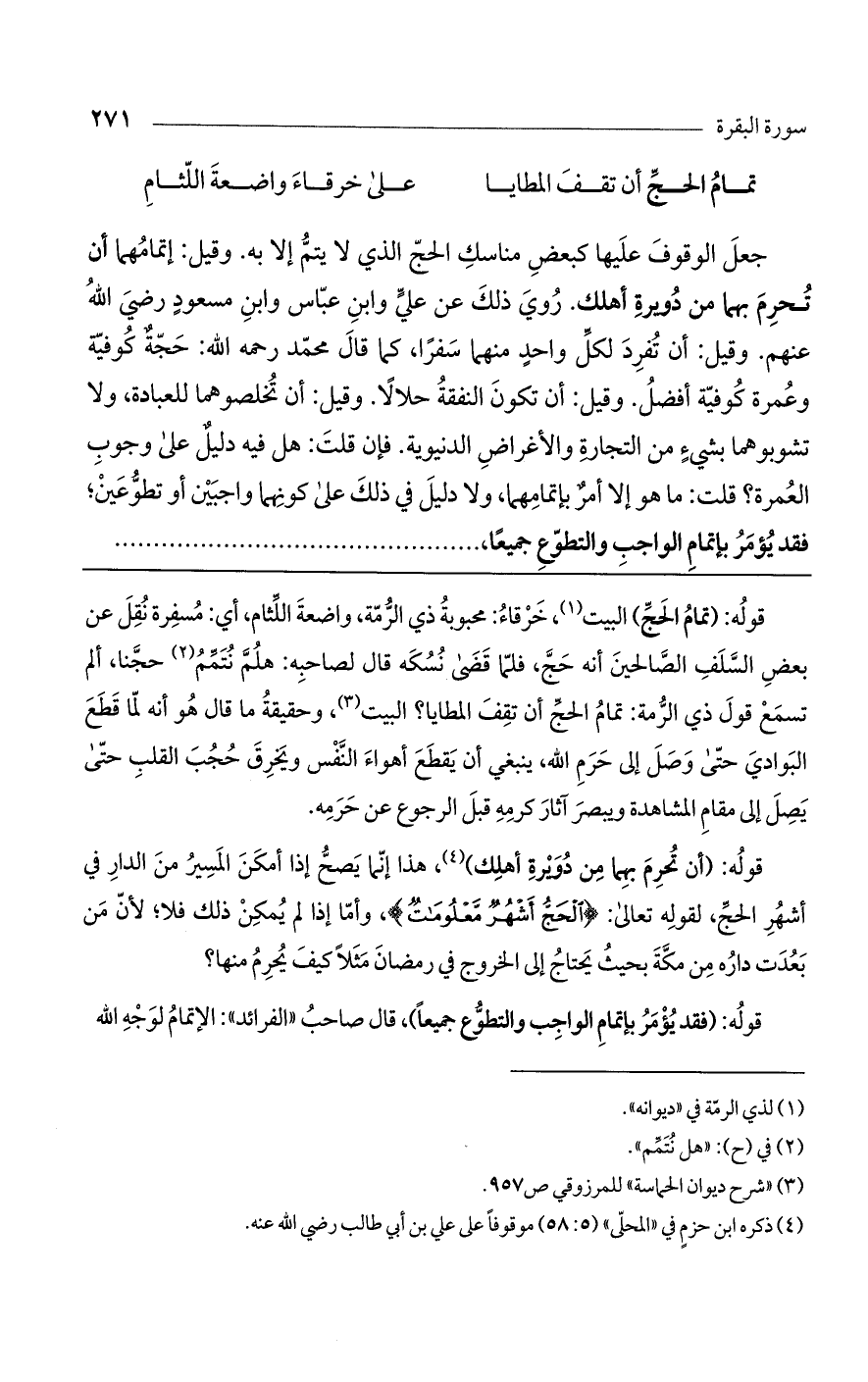 قوله: (تمام الحج) البيت، خرقاء: محبوبة ذي الرمة، واضعة اللثام، أي: مسفرة نقل عن بعض السلف الصالحين أنه حج، فلما قضى نسكه قال لصاحبه: هلم نتمم حجنا، ألم تسمع قول ذي الرمة: تمام الحج أن تقف المطايا؟ البيت، وحقيقة ما قال هو أنه لما قطع البوادي حتى وصل إلى حرم الله، ينبغي أن يقطع أهواء النفس ويخرق حجب القلب حتى يصل إلى مقام المشاهدة ويبصر آثار كرمه قبل الرجوع عن حرمه.