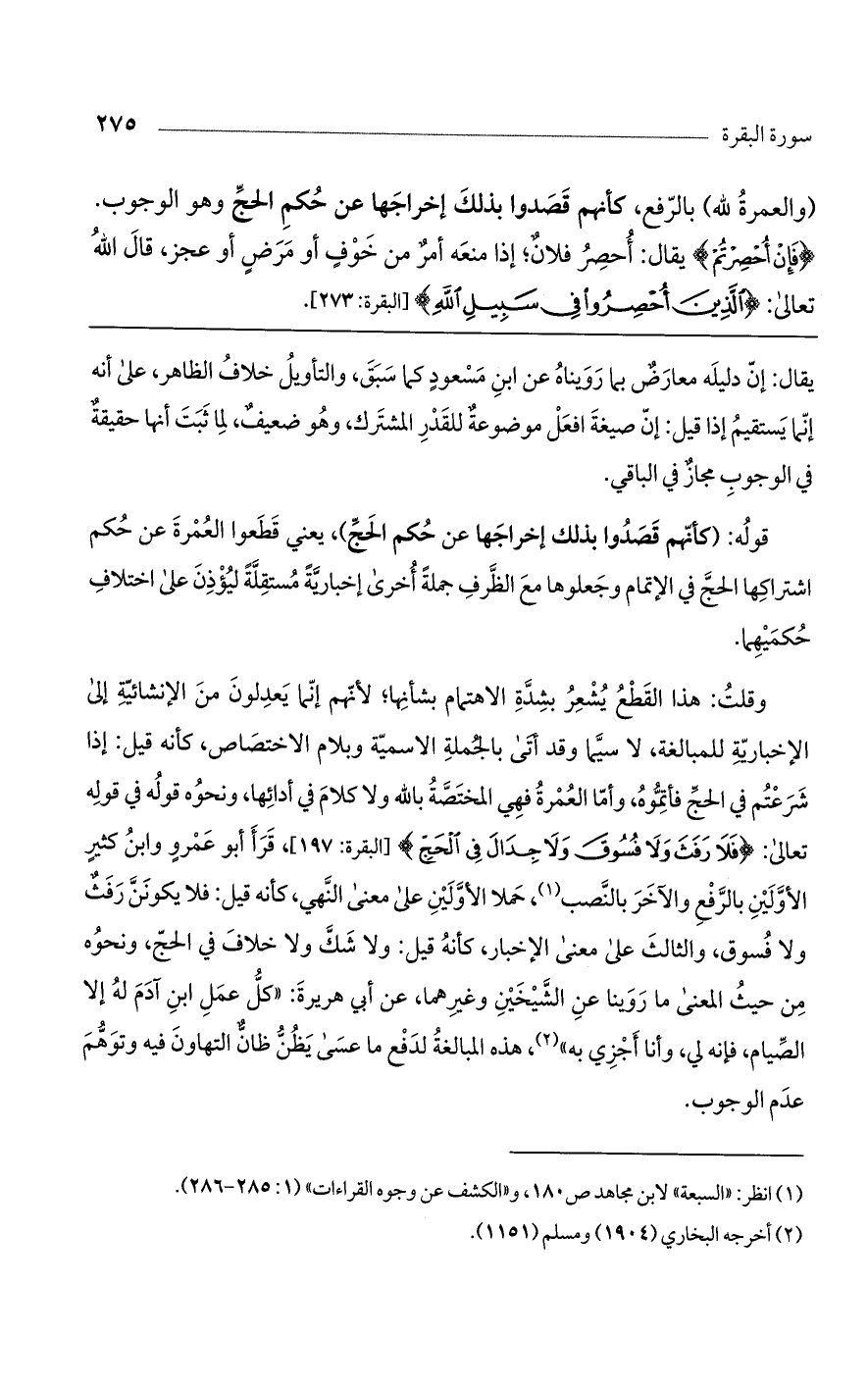 وقلت: هذا القطع يشعر بشدة الاهتمام بشأنها؛ لأنهم غنما يعدلون من الإنشائية إلى الإخبارية للمبالغة، لاسيما وقد أتى بالجملة الاسمية وبلام الاختصاص، كأنه قيل: إذا شرعتم في الحج فأتموه، وأما العمرة فهي المختصة بالله ولا كلام في أدائها، ونحوه قولُه في قولِه تعالى: (فَلا رَفَثَ وَلا فُسُوقَ وَلا جِدَالَ فِي الْحَجِّ) [البقرة: 197]، قرأ أبو عمرو وابن كثير الأولين بالرفع والآخر بالنصب، حملا الأولين على معنى النهي، كأنه قيل: فلا يكونن رفث ولا فسوق، والثالث على معنى الإخبار، كأنه قيل: ولاشك ولا خلاف في الحج، ونحوه من حيث المعنى ما روينا عن الشيخين وغيرهما، عن أبي هريرة: "كل عمل ابن آدم له إلا الصيام، فإنه لي، وأنا أجزي به"، هذه المبالغة لدفع ما عسى يظن ظان التهاون فيه وتوهم عدم الوجوب.
