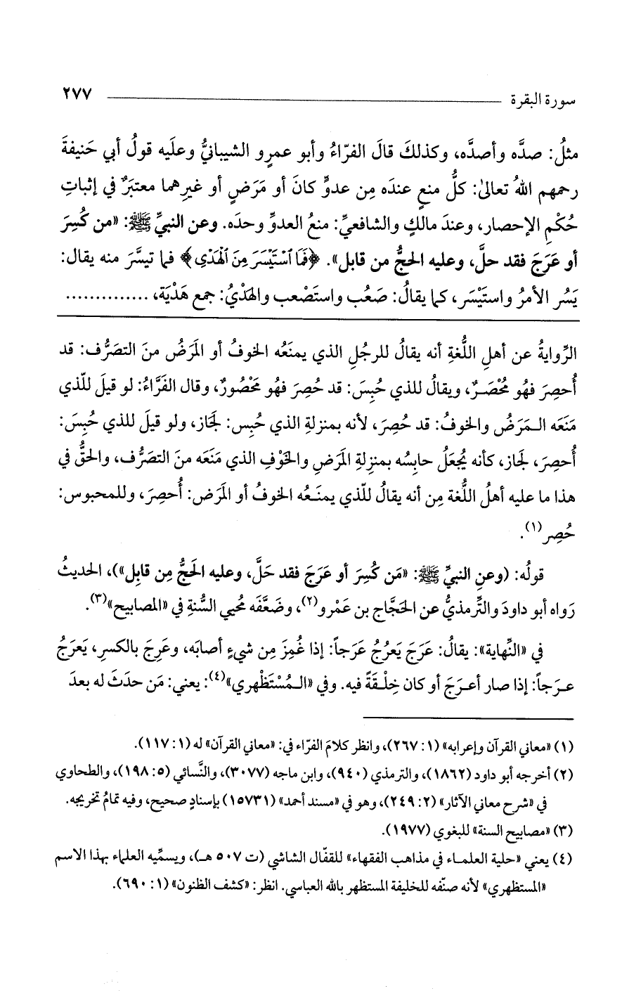 مثل: صدّه وأصدّه، وكذلك قال الفرّاء وأبو عمرو الشيباني، وعليه قول أبى حنيفة رحمهم اللَّه تعالى: كل منع عنده من عدوّ كان أو مرض أو غيرهما معتبر في إثبات حكم الإحصار، وعند مالك والشافعي: منع العدوّ وحده.