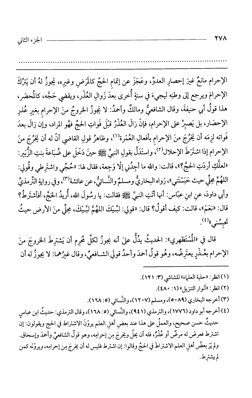 الإحرام مانع غير إحصار العدو، وعجز عن إتمام الحج كالمرض وغيره، يجوز له أن يترك الإحرام ويرجع إلى وطنه ليجيء في سنة أخرى بعد زوال العذر، ويقضي حجه، كالمحصر، هذا قول أبي حنيفة، وقال الشافعي ومالك وأحمد: لا يجوز الخروج من الإحرام بغير عذر الإحصار، بل يصبر على الإحرام، فإن زال العذر قبل فوات الحج فهو المراد، وإن زال بعد فواته لزمه أن يخرج من الإحرام بأفعال العمرة، وظاهر قول القاضي أن له أن يخرج من الإحرام إذا اشترط الإحلال، واستدل بقول النبي صلى الله عليه وسلم حين دخل على ضباعة بنت الزبير: "لعلك أردت الحج؟ "، قالت: والله ما أجدني إلا وجعة، فقال لها: "حجي واشترطي وقولي: اللهم محلي حيث حبستني"، رواه البخاري ومسلم والنسائي، عن عائشة، وفي رواية الترمذي وأبي داود، عن ابن عباس: أنها أتت النبي صلى الله عليه وسلم فقالت: يا رسول الله، أريد الحج، أفأشترط؟ قال: "نعم"، قالت: كيف أقول؟ قال: "قولي: لبيك اللهم لبيك، محلي من الأرض حيث تحبسني".