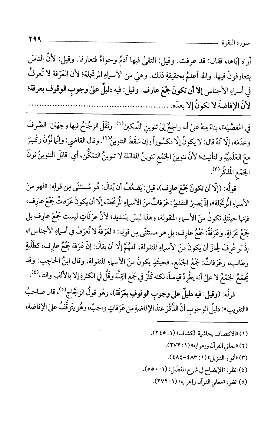 أراه إياها، فقال: قد عرفت. وقيل: التقى فيها آدم وحوّاء فتعارفا. وقيل: لأنّ الناس يتعارفون فيها واللَّه أعلم بحقيقة ذلك. وهي من الأسماء المرتجلة؛ لأنّ العرفة لا تعرف في أسماء الأجناس إلا أن تكون جمع عارف. وقيل: فيه دليل على وجوب الوقوف بعرفة؛ لأنّ الإفاضة لا تكون إلا بعده. ......