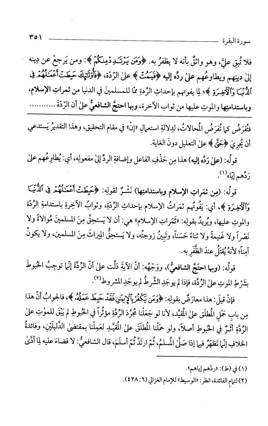 فإن قيل: هذا معارض بقوله: (وَمَنْ يَكْفُرْ بِالإِيمَانِ فَقَدْ حَبِطَ عَمَلُهُ)، فالجواب أن هذا من باب حمل المطلق على المقيد، لأنا لو جعلنا مجرد الردة مؤثراً في الحبوط لم يبق للموت على الردة أثر في الحبوط أصلاً، ولو حملنا المطلق على المقيد لعملنا بمقتضى الدليلين، وفائدة الخلاف إنما تظهر فيما إذا صلى المسلم، ثم ارتد ثم أسلم، قال الشافعي: لا قضاء عليه لما أدى