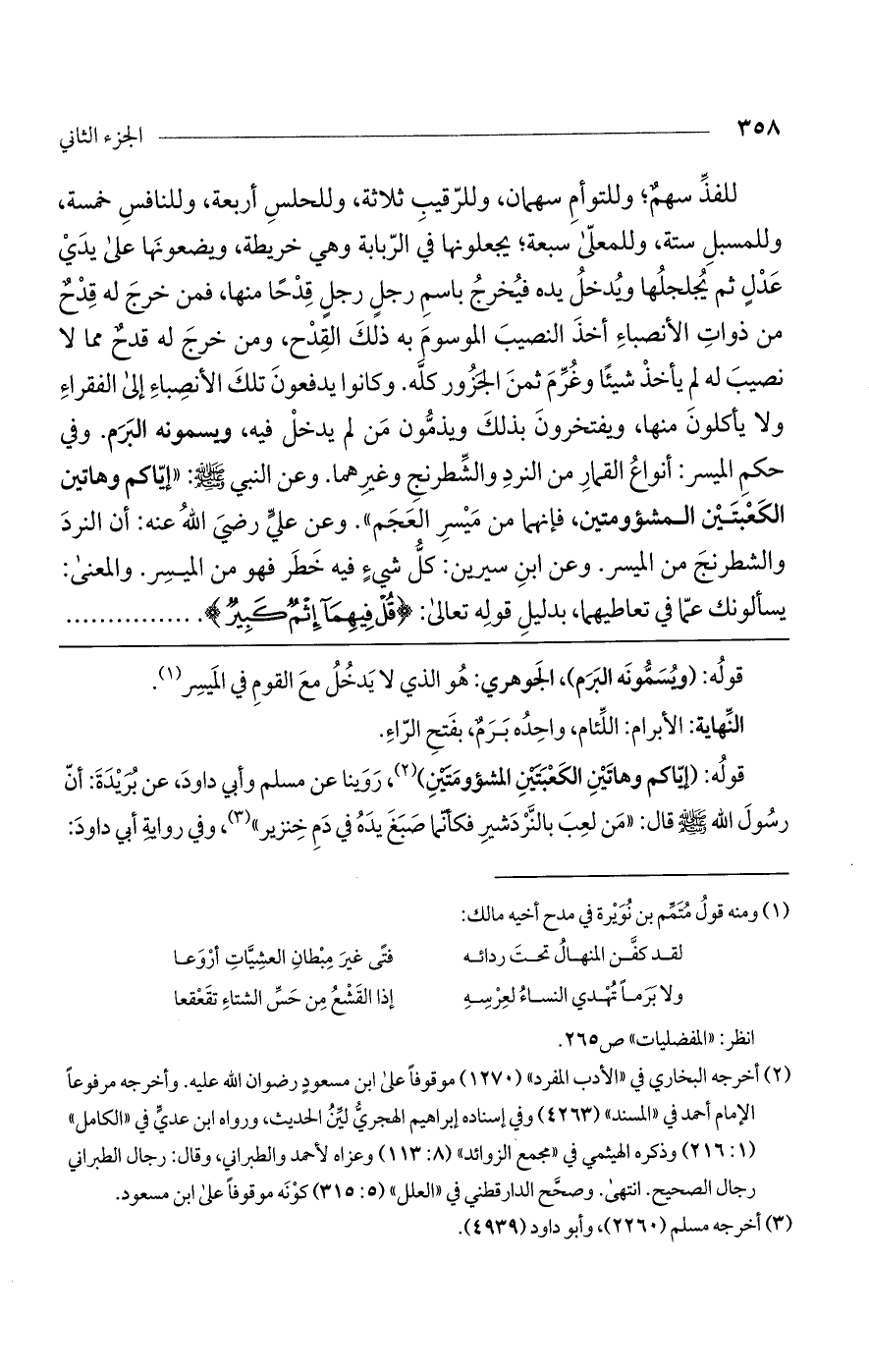 للفذ سهم؛ وللتوأم سهمان، وللرقيب ثلاثة، وللحلس أربعة، وللنافس خمسة، وللمسبل ستة، وللمعلى سبعة؛ يجعلونها في الربابة وهي خريطة، ويضعونها على يدي عدلٍ ثم يجلجلها ويدخل يده فيخرج باسم رجلٍ رجلٍ قدحاً منها، فمن خرج له قدح من ذوات الأنصباء أخذ النصيب الموسوم به ذلك القدح، ومن خرج له قدح مما لا نصيب له لم يأخذ شيئاً وغرم ثمن الجزور كله. وكانوا يدفعون تلك الأنصباء إلى الفقراء ولا يأكلون منها، ويفتخرون بذلك ويذمون من لم يدخل فيه، ويسمونه البرم. وفي حكم الميسر: أنواع القمار، من النرد والشطرنج وغيرهما. وعن النبي صلى اللَّه عليه وسلم: «إياكم وهاتين اللعبتين المشئومتين فإنهما من ميسر العجم». وعن عليّ رضي اللَّه عنه: أنّ النرد والشطرنج من الميسر. وعن ابن سيرين: كل شيءٍ فيه خطر فهو من الميسر. والمعنى: يسألونك عما في تعاطيهما، بدليل قوله تعالى: (قُلْ فِيهِما إِثْمٌ كَبِيرٌ) .......