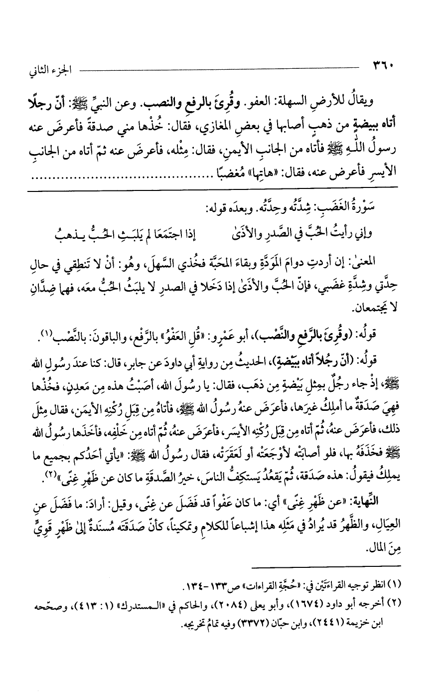 ويقال للأرض السهلة: العفو. وقرئ بالرفع والنصب. وعن النبي صلى اللَّه عليه وسلم: أنّ رجلاً أتاه ببيضةٍ من ذهب أصابها في بعض المغازي، فقال: خذها مني صدقة فأعرض عنه رسول اللَّه صلى اللَّه عليه وسلم فأتاه من الجانب الأيمن، فقال: مثله، فأعرض عنه ثم أتاه من الجانب الأيسر فأعرض عنه، فقال: "هاتها" مغضباً ....