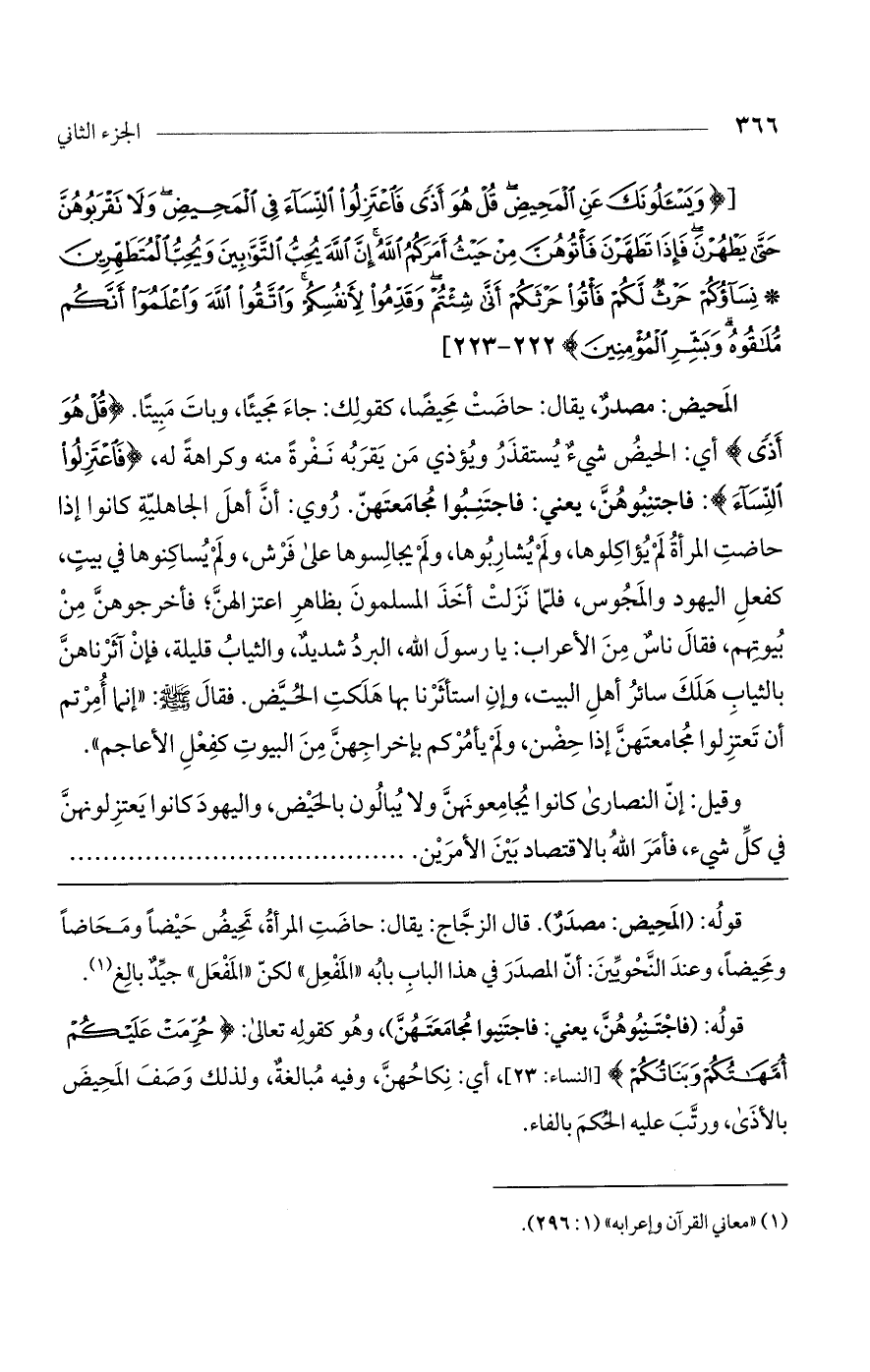 [(وَيَسْئَلُونَكَ عَنِ الْمَحِيضِ قُلْ هُوَ أَذىً فَاعْتَزِلُوا النِّساءَ فِي الْمَحِيضِ وَلا تَقْرَبُوهُنَّ حَتَّى يَطْهُرْنَ فَإِذا تَطَهَّرْنَ فَاتُوهُنَّ مِنْ حَيْثُ أَمَرَكُمُ اللَّهُ إِنَّ اللَّهَ يُحِبُّ التَّوَّابِينَ وَيُحِبُّ الْمُتَطَهِّرِينَ* نِساؤُكُمْ حَرْثٌ لَكُمْ فَاتُوا حَرْثَكُمْ أَنَّى شِئْتُمْ وَقَدِّمُوا لِأَنْفُسِكُمْ وَاتَّقُوا اللَّهَ وَاعْلَمُوا أَنَّكُمْ مُلاقُوهُ وَبَشِّرِ الْمُؤْمِنِينَ)].