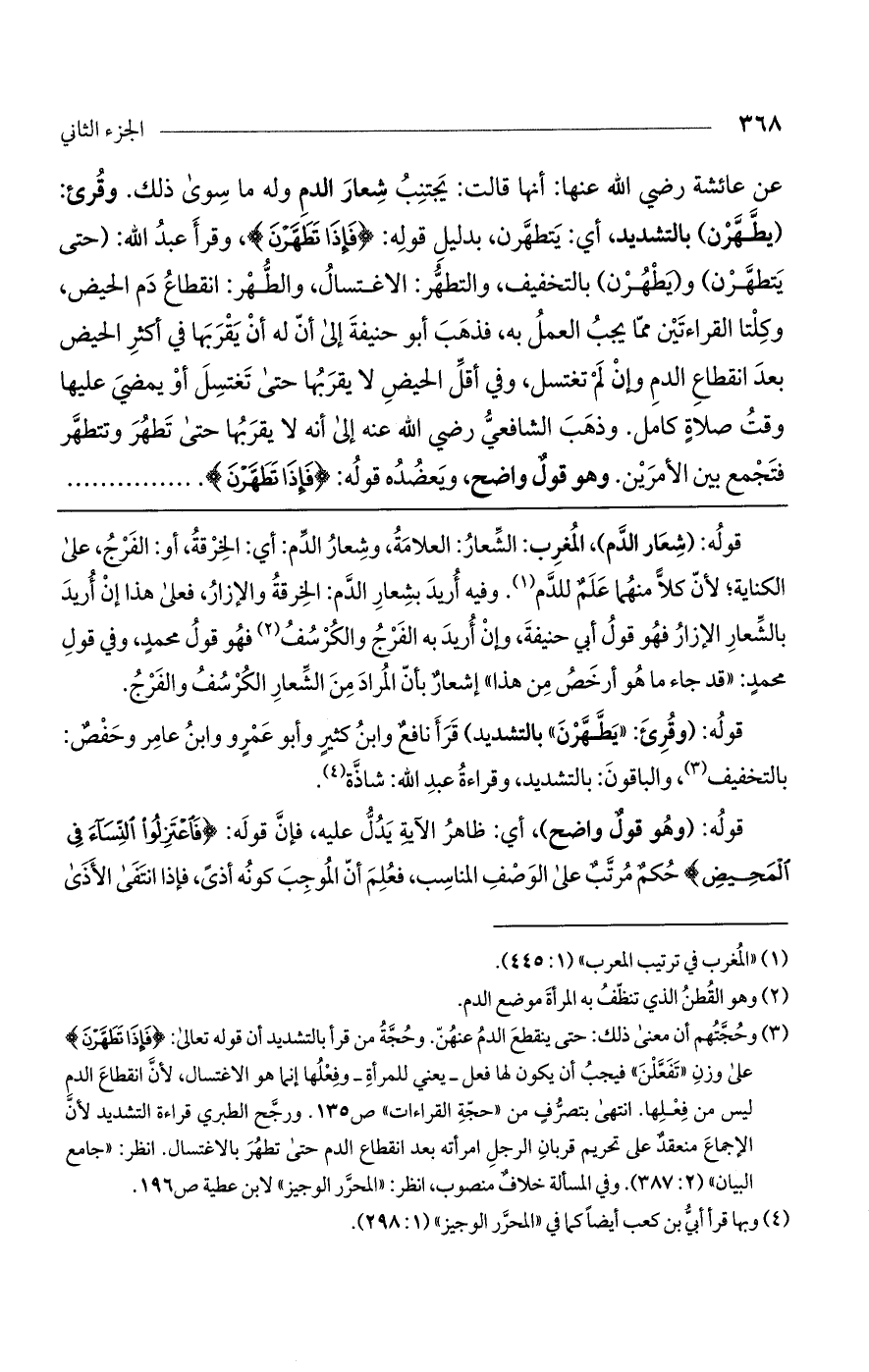 عن عائشة رضي اللَّه عنها: أنها قالت: يجتنب شعار الدم وله ما سوى ذلك. وقرئ: (يطهرن) بالتشديد، أي: يتطهرن، بدليل قوله: (فَإِذا تَطَهَّرْنَ)، وقرأ عبد اللَّه: (حتى يتطهرن) و (يطهرن) بالتخفيف، والتطهر: الاغتسال، والطهر: انقطاع دم الحيض، وكلتا القراءتين مما يجب العمل به، فذهب أبو حنيفة إلى أن له أن يقربها في أكثر الحيض بعد انقطاع الدم وإن لم تغتسل، وفي أقل الحيض لا يقربها حتى تغتسل أو يمضي عليها وقت صلاةٍ كامل. وذهب الشافعي رضي الله عنه إلى أنه لا يقربها حتى تطهر وتتطهر فتجمع بين الأمرين. وهو قول واضح، ويعضده قوله: (فَإِذا تَطَهَّرْنَ) ......