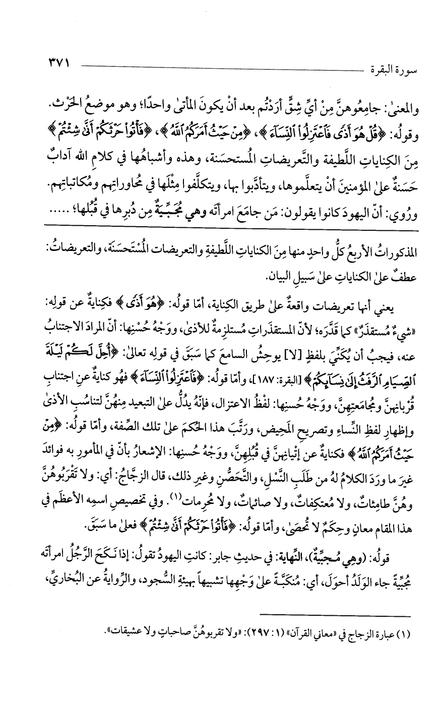 والمعنى: جامعوهن من أي: شق أدرتم بعد أن يكون المأتى واحداً؛ وهو موضع الحرث. وقوله: (هُوَ أَذىً فَاعْتَزِلُوا النِّساءَ)، (مِنْ حَيْثُ أَمَرَكُمُ اللَّهُ)، (فَاتُوا حَرْثَكُمْ أَنَّى شِئْتُمْ) من الكنايات اللطيفة والتعريضات المستحسنة، وهذه وأشباهها في كلام اللَّه آداب حسنة على المؤمنين أن يتعلموها، ويتأدّبوا بها، ويتكلفوا مثلها في محاورتهم ومكاتبتهم. وروي: أن اليهود كانوا يقولون: من جامع امرأته وهي مجبية من دبرها في قبلها؛ .....
