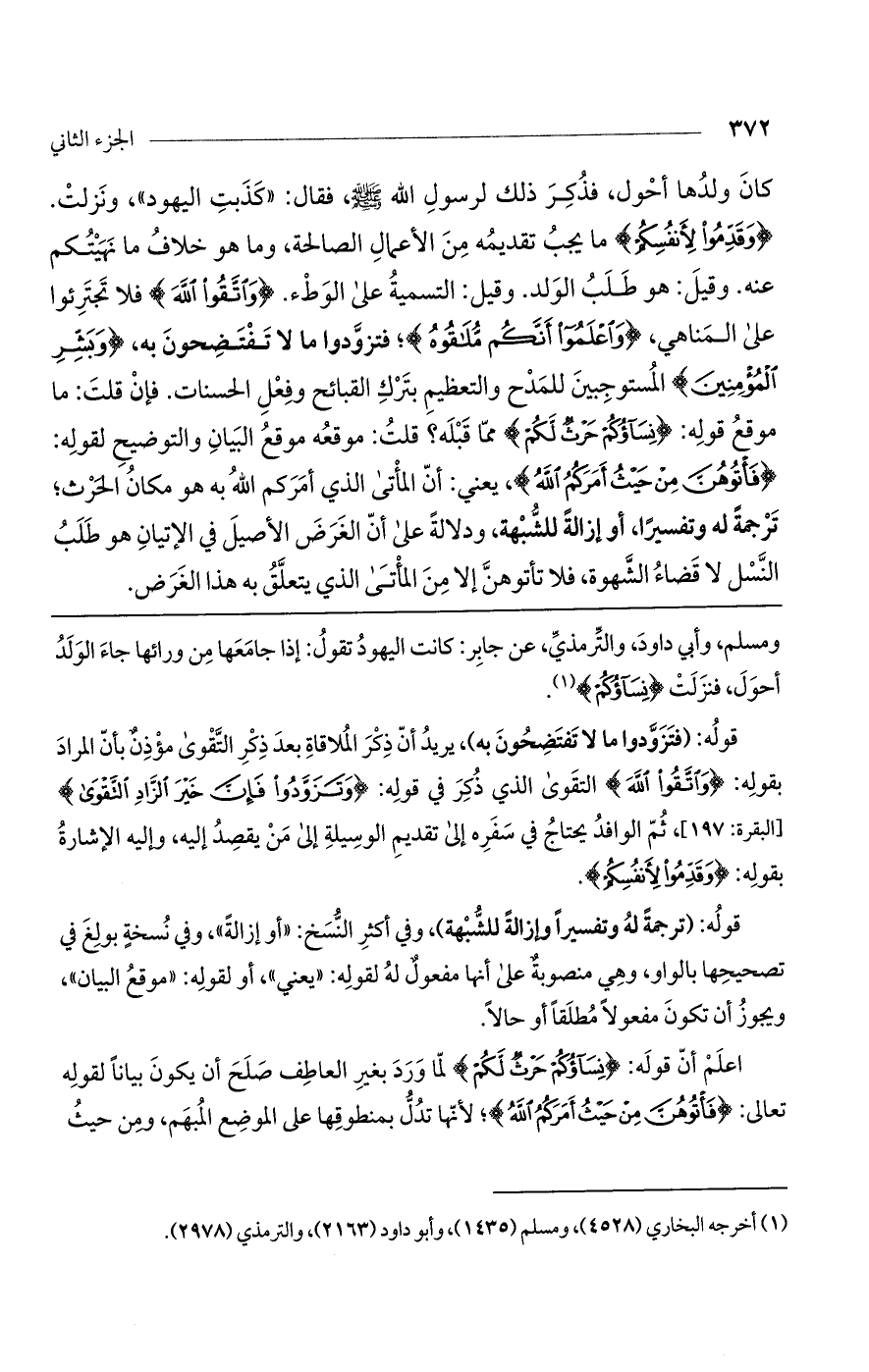 ومسلم، وأبي داود، والترمذي، عن جابر: كانت اليهود تقول: إذا جامعها من ورائها جاء الولد أحول، فنزلت (نِسَاؤُكُمْ).