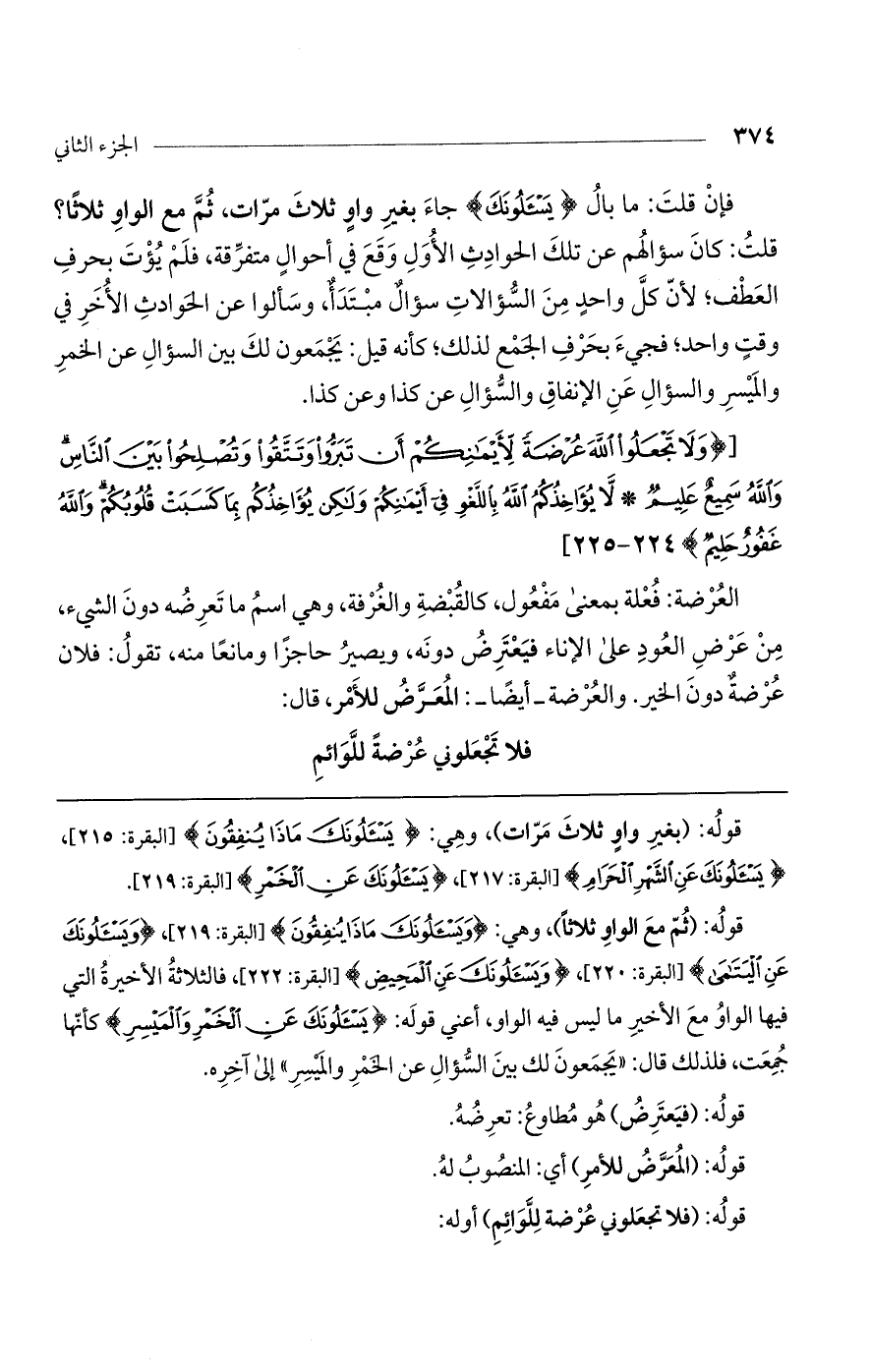 فإن قلت: ما بال (يَسْئَلُونَكَ) جاء بغير واو ثلاث مرات، ثم مع الواو ثلاثاً؟ قلت: كان سؤالهم عن تلك الحوادث الأول وقع في أحوال متفرّقة، فلم يؤت بحرف العطف؛ لأنّ كل واحد من السؤالات سؤال مبتدأ، وسألوا عن الحوادث الأخر في وقت واحد؛ فجيء بحرف الجمع لذلك؛ كأنه قيل: يجمعون لك بين السؤال عن الخمر والميسر، والسؤال عن الإنفاق، والسؤال عن كذا وكذا.