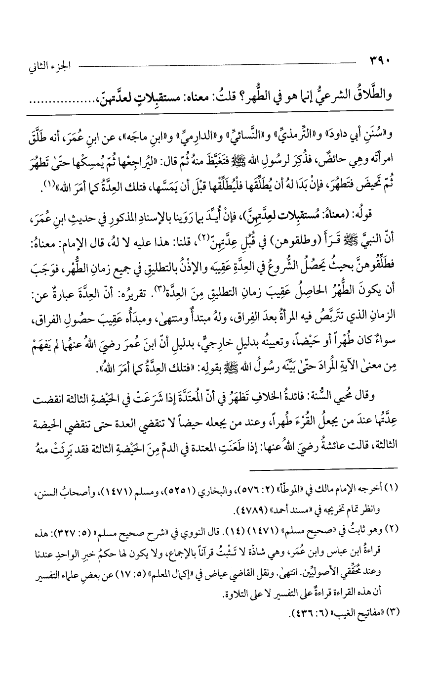و"سنن أبي داود" و"الترمذي" و"النسائي" و"الدارمي" و"ابن ماجة"، عن ابن عمر، أنه طلق امرأته وهي حائض، فذكر لرسول الله صلى الله عليه وسلم فتغيظ منه ثم قال: "ليراجعها ثم يمسكها حتى تطهر ثم تحيض فتطهر، فإن بدا له أن يطلقها فليطلقها قبل أن يمسها، فتلك العدة كما أمر الله".