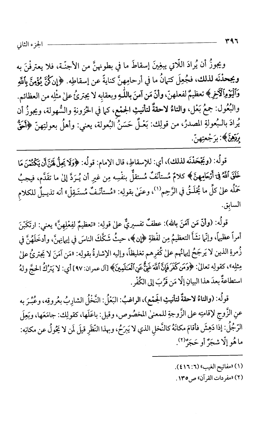 ويجوز أن يراد اللاتي يبغين إسقاط ما في بطونهن من الأجنة، فلا يعترفن به ويجحدنه لذلك، فجعل كتمان ما في أرحامهن كناية عن إسقاطه. (إِنْ كُنَّ يُؤْمِنَّ بِاللَّهِ وَالْيَوْمِ الْآخِرِ) تعظيم لفعلهن، وأن من آمن باللَّه وبعقابه لا يجترئ على مثله من العظائم. والبعول: جمع بعل، والتاء لاحقة لتأنيث الجمع، كما في الحزونة والسهولة، ويجوز أن يراد بالبعولة المصدر، من قولك: بعل حسن البعولة، يعني: وأهل بعولتهن (أَحَقُّ بِرَدِّهِنَّ): برجعتهن.