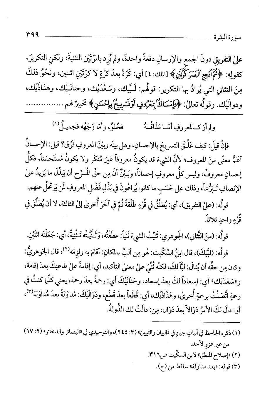 على التفريق دون الجمع والإرسال دفعة واحدةً، ولم يرد بالمرتين التثنية، ولكن التكرير، كقوله: (ثُمَّ ارْجِعِ الْبَصَرَ كَرَّتَيْنِ) [الملك: 4] أي: كرّةً بعد كرّةٍ، لا كرّتين اثنتين، ونحو ذلك من التثاني التي يراد بها التكرير: قولهم: لبيك، وسعديك، وحنانيك، وهذاذيك، ودواليك. وقوله تعالى: (فَإِمْساكٌ بِمَعْرُوفٍ أَوْ تَسْرِيحٌ بِإِحْسانٍ) تخيير لهم ....