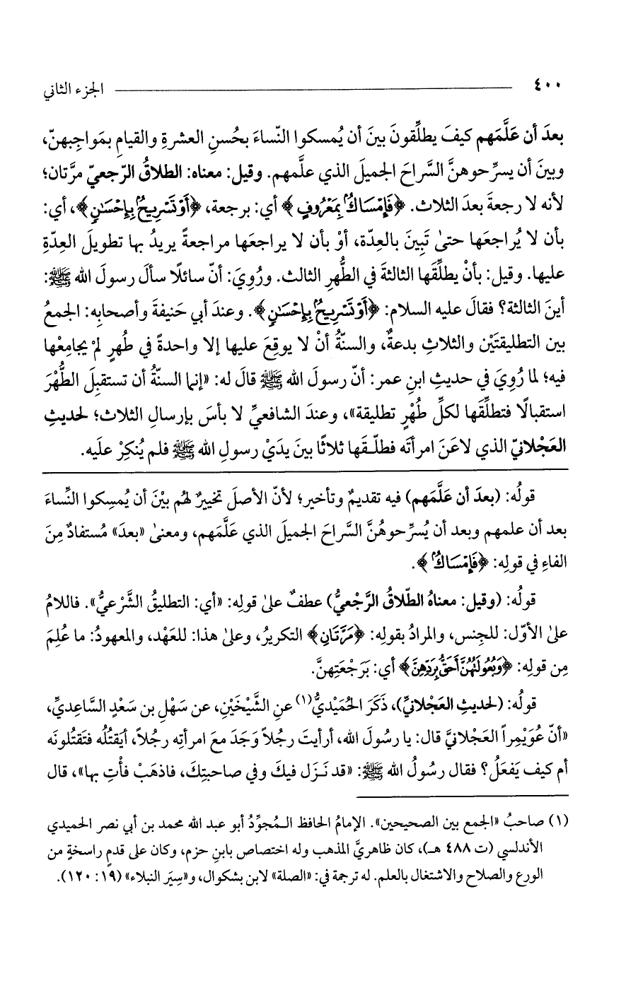بعد أن علمهم كيف يطلقون بين أن يمسكوا النساء بحسن العشرة والقيام بمواجبهنّ، وبين أن يسرحوهنّ السراح الجميل الذي علمهم. وقيل: معناه الطلاق الرجعى مرّتان؛ لأنه لا رجعة بعد الثلاث. (فإمساك بمعروف) أي: برجعة، (أو تسريح بإحسان)، أي: بأن لا يراجعها حتى تبين بالعدّة، أو بأن لا يراجعها مراجعة يريد بها تطويل العدة عليها. وقيل: بأن يطلقها الثالثة في الطهر الثالث. وروي: أنّ سائلاً سأل رسول اللَّه صلى اللَّه عليه وسلم: أين الثالثة؟ فقال عليه الصلاة والسلام: (أو تسريح بإحسان). وعند أبي حنيفة وأصحابه: الجمع بين التطليقتين والثلاث بدعة، والسنة أن لا يوقع عليها إلا واحدة في طهرٍ لم يجامعها فيه؛ لما روي في حديث ابن عمر: أنّ رسول اللَّه صلى اللَّه عليه وسلم قال له: «إنما السنة أن تستقبل الطهر استقبالاً فتطلقها لكل قرء تطليقة»، وعند الشافعي لا بأس بإرسال الثلاث؛ لحديث العجلاني الذي لاعن امرأته فطلقها ثلاثاً بين يدي رسول اللَّه صلى اللَّه عليه وسلم فلم ينكر عليه.