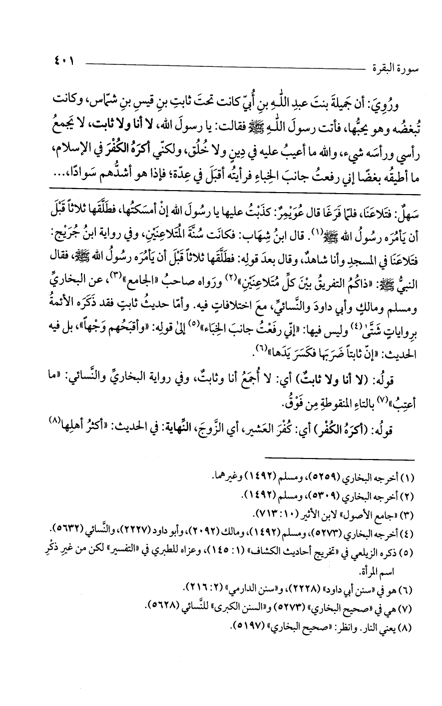 سهل: فتلاعنا، فلما فرغا قال عويمر: كذبت عليها يا رسول الله إن أمسكتها، فطلقها ثلاثاً قبل أن يأمره رسول الله صلى الله عليه وسلم. قال ابن شهاب: فكانت سنة المتلاعنين، وفي رواية ابن جريج: فتلاعنا في المسجد وأنا شاهد، وقال بعد قوله: فطلقها ثلاثاً قبل أن يأمره رسول الله صلى الله عليه وسلم، فقال النبي صلى الله عليه وسلم: "ذاكم التفريق بين كل متلاعنين" ورواه صاحب "الجامع"، عن البخاري ومسلم ومالك وأبي داود والنسائي، مع اختلافات فيه. وأما حديث ثابت فقد ذكره الأئمة بروايات شتى وليس فيها: "إني رفعت جانب الخباء" إلى قوله: "وأقبحهم وجهاً"، بل فيه الحديث: "إن ثابتاً ضربها فكسر يدها".