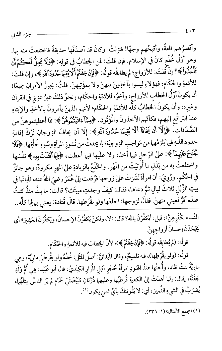 وأقصرهم قامةً، وأقبحهم وجهاًَ فنزلت. وكان قد أصدقها حديقةً فاختلعت منه بها. وهو أوّل خلع كان في الإسلام. فإن قلت: لمن الخطاب في قوله: (وَلا يَحِلُّ لَكُمْ أَنْ تَاخُذُوا)؟ إن قلت: للأزواج لم يطابقه قوله: (فَإِنْ خِفْتُمْ أَلَّا يُقِيما حُدُودَ اللَّهِ)، وإن قلت: للأئمة والحكام؛ فهؤلاء ليسوا بآخذين منهن ولا بمؤتيهن. قلت: يجوز الأمران جميعاً؛ أن يكون أوّل الخطاب للأزواج، وآخره للأئمة والحكام، ونحو ذلك غير عزيز في القرآن وغيره، وأن يكون الخطاب كله للأئمة والحكام؛ لأنهم الذين يأمرون بالأخذ والإيتاء عند الترافع إليهم، فكأنهم الآخذون والمؤتون. (مِمَّا آتَيْتُمُوهُنَّ): مما أعطيتموهنّ من الصدقات، (إِلَّا أَنْ يَخافا أَلَّا يُقِيما حُدُودَ اللَّهِ): إلا أن يخاف الزوجان ترك إقامة حدود اللَّه فيما يلزمهما من مواجب الزوجية؛ لما يحدث من نشوز المرأة وسوء خلقها. (فَلا جُناحَ عَلَيْهِما): على الرجل فيما أخذ، ولا عليها فيما أعطت، (فِيمَا افْتَدَتْ بِهِ) نفسها واختلعت به من بذل ما أوتيت من المهر. والخلع بالزيادة على المهر مكروه؛ وهو جائز في الحكم. وروي: أن امرأة نشزت على زوجها فرفعت إلى عمر رضى اللَّه عنه، فأباتها في بيت الزبل ثلاث ليالٍ ثم دعاها، فقال: كيف وجدت مبيتك؟ قالت: ما بت منذ كنت عنده أقرّ لعيني منهن. فقال لزوجها: اخلعها ولو بقرطها. قال قتادة: يعني بمالها كله ....