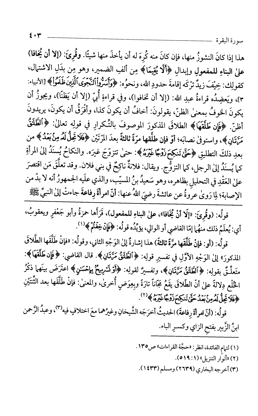 هذا إذا كان النشوز منها، فإن كان منه كره له أن يأخذ منها شيئاً. وقرئ: (إلا أن يخافا) على البناء للمفعول وإبدال (ألا يقيما) من ألف الضمير، وهو من بدل الاشتمال، كقولك: خيف زيد تركه إقامة حدود اللَّه، ونحوه: (وَأَسَرُّوا النَّجْوَى الَّذِينَ ظَلَمُوا) [الأنبياء: 3]، ويعضده قراءة عبد اللَّه: (إلا أن تخافوا)، وفي قراءة أبىّ (إلا أن يظنا)، ويجوز أن يكون الخوف بمعنى الظن، يقولون: أخاف أن يكون كذا، وأفرق أن يكون، يريدون أظن. (فَإِنْ طَلَّقَها) الطلاق المذكور الموصوف بالتكرار في قوله تعالى: (الطَّلاقُ مَرَّتانِ)، واستوفى نصابه؛ أو فإن طلقها مرةً ثالثةً بعد المرّتين (فَلا تَحِلُّ لَهُ مِنْ بَعْدُ) من بعد ذلك التطليق (حَتَّى تَنْكِحَ زَوْجاً غَيْرَهُ): حتى تتزوّج غيره. والنكاح يسند إلى المرأة كما يسند إلى الرجل، كما التزوج. ويقال: فلانة ناكح في بنى فلان. وقد تعلق من اقتصر على العقد في التحليل بظاهره، وهو سعيد ابن المسيب، والذي عليه الجمهور أنه لا بد من الإصابة؛ لما روى عروة عن عائشة رضي اللَّه عنها: أنّ امرأة رفاعة جاءت إلى النبي صلى اللَّه عليه وسلم