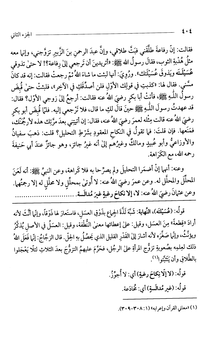 فقالت: إن رفاعة طلقني فبت طلاقي، وإن عبد الرحمن بن الزبير تزوّجني، وإنما معه مثل هُدبة الثوب، فقال رسول اللَّه صلى اللَّه عليه وسلم: أتريدين أن ترجعي إلى رفاعة؟ ! لا حتى تذوقي عُسيلته ويذوق عُسيلتك". وروي: أنها لبثت ما شاء اللَّه ثم رجعت فقالت: إنه كان قد مسني. فقال لها: "كذبت في قولك الأوّل فلن أصدّقك في الآخر"، فلبثت حتى قبض رسول اللَّه صلى اللَّه عليه وسلم، فأتت أبا بكر رضى اللَّه عنه فقالت: أرجع إلى زوجي الأوّل؟ فقال: قد عهدت رسول اللَّه صلى اللَّه عليه وسلم حين قال لك ما قال، فلا ترجعي إليه. فلما قبض أبو بكر رضى اللَّه عنه قالت مثله لعمر رضى اللَّه عنه فقال: إن أتيتينى بعد مرّتك هذه لأرجمنك، فمنعها. فإن قلت: فما تقول في النكاح المعقود بشرط التحليل؟ قلت: ذهب سفيان والأوزاعي وأبو عبيدٍ ومالكٌ وغيرهم إلى أنه غير جائز، وهو جائزٌ عند أبى حنيفة مع الكراهة.