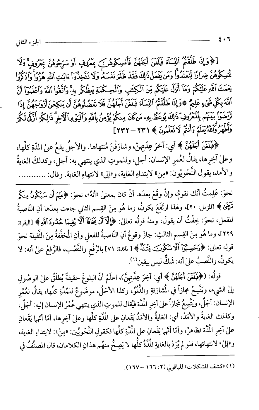(فَبَلَغْنَ أَجَلَهُنَّ) أي: آخر عدتهن، وشارفن منتهاها. والأجل يقع على المدّة كلها، وعلى آخرها، يقال لعمر الإنسان: أجل، وللموت الذي ينتهى به: أجل، وكذلك الغاية والأمد، يقول النحويون: «من» لابتداء الغاية، و «إلى» لانتهاء الغاية. وقال: ......