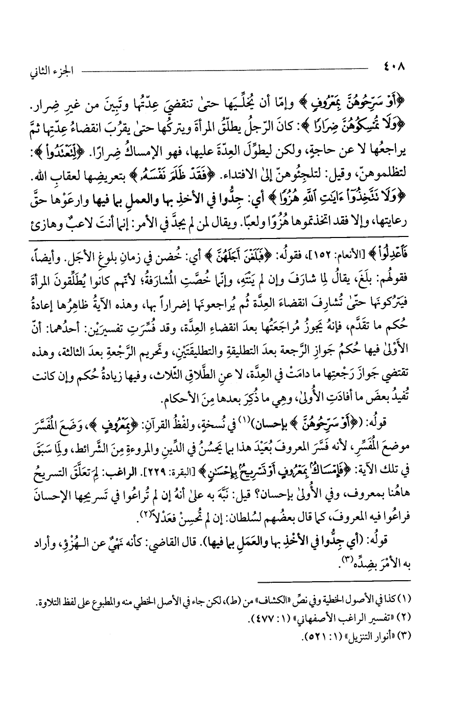 قوله: ((أَوْ سَرِّحُوهُنَّ) بإحسان في نسخة، ولفظ القرآن: (بِمَعْرُوفٍ)، وضع المفسر موضع المفسر، لأنه فسر المعروف بعيد هذا بما يحسن في الدين والمروءة من الشرائط، ولما سبق في تلك الآية: (فَإمْسَاكٌ بِمَعْرُوفٍ أَوْ تَسْرِيحٌ بِإِحْسَانٍ) [البقرة: 229]. الراغب: لم تعلق التسريح ها هنا بمعروف، وفي الأولى بإحسان؟ قيل: نبه به على أنه إن لم تراعوا في تسريحها الإحسان فراعوا فيه المعروف، كما قال بعضهم لسلطان: إن لم تحسن فعدلاً.